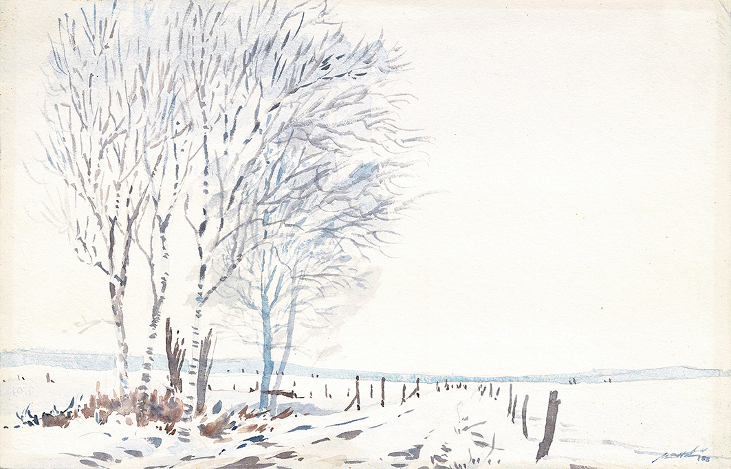 Paysage enneigé, dessin original à la gouache. Dimensions : 50,5 cm x 33 cm.