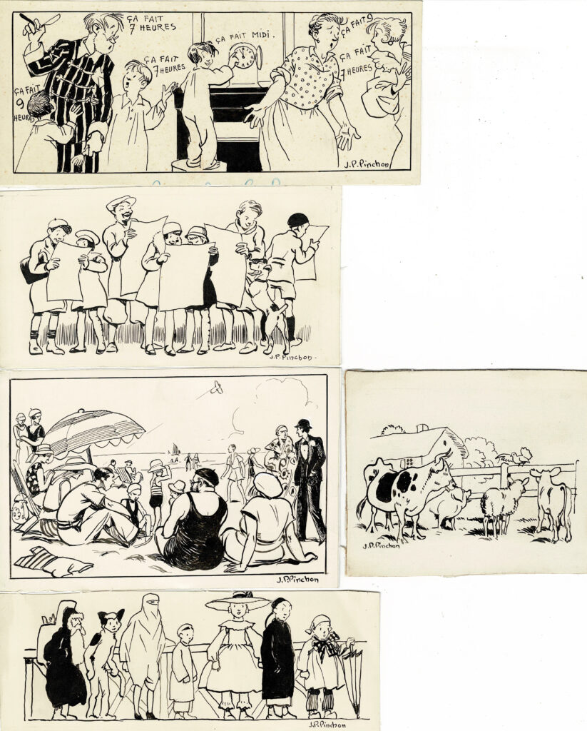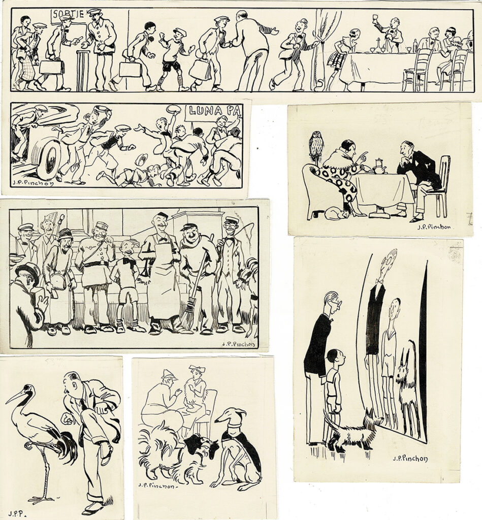 Ensemble de 11 dessins originaux à l’encre de chine. Formats divers.