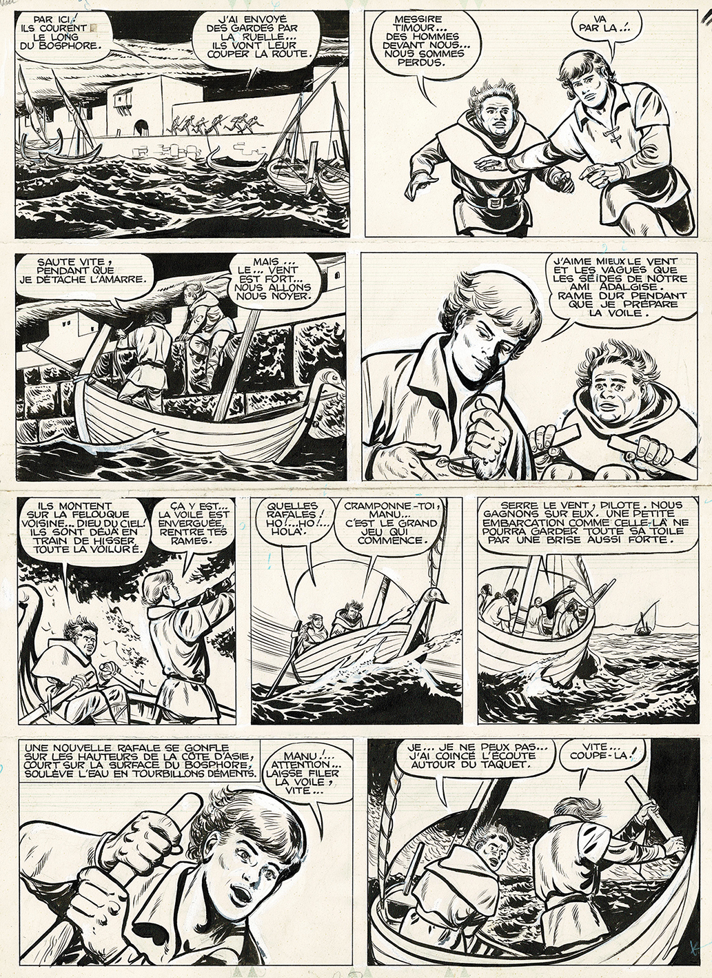 Les Timour, La gondole noire, planche originale à l’encre de chine pour cet album paru en 1967 chez Dupuis. Dimensions : 53 cm x 41 cm.