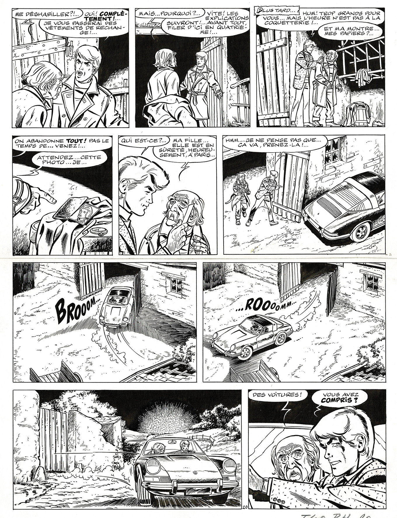 Ric Hochet, planche originale à l’encre de chine réalisée pour l’album « Ric Hochet contre le bourreau » paru en 1972 au Lombard. Dimensions : 41,5 cm x 32 cm.