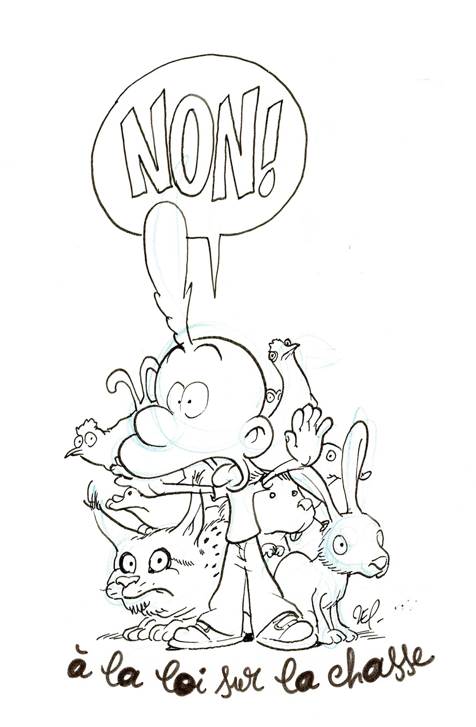 Titeuf, Non à la loi sur la chasse, dessin original à l’encre de chine. Dimensions : 21 cm x 11,5 cm.