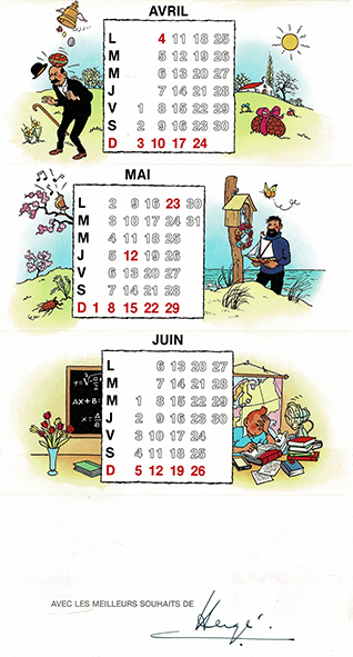 Tintin, carte de voeux de 1983 : carte-calendrier dépliante en six panneaux-saison, signée. Proche de l’état neuf.