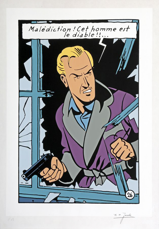 Blake et Mortimer, sérigraphie « Blake malédiction » n°E.A., signée (Ed. Repérages, 1981). Dimensions : 75 cm x 55 cm.