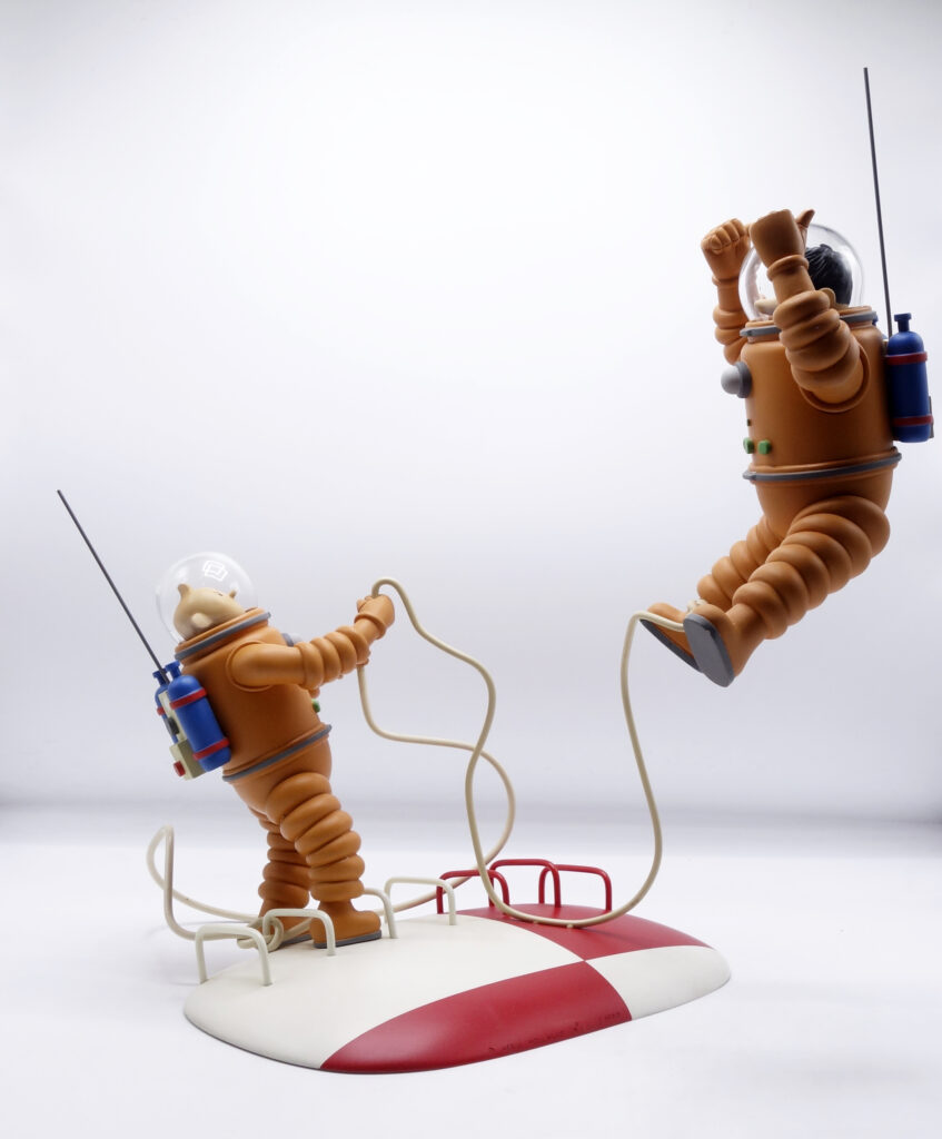 MOULINSART LEBLON : Tintin, 45909, Haddock cosmonautes sur socle fusée (avec casques en verre), On a marché sur la lune, 2001, 1999 ex., 36 cm, Boite abîmée.