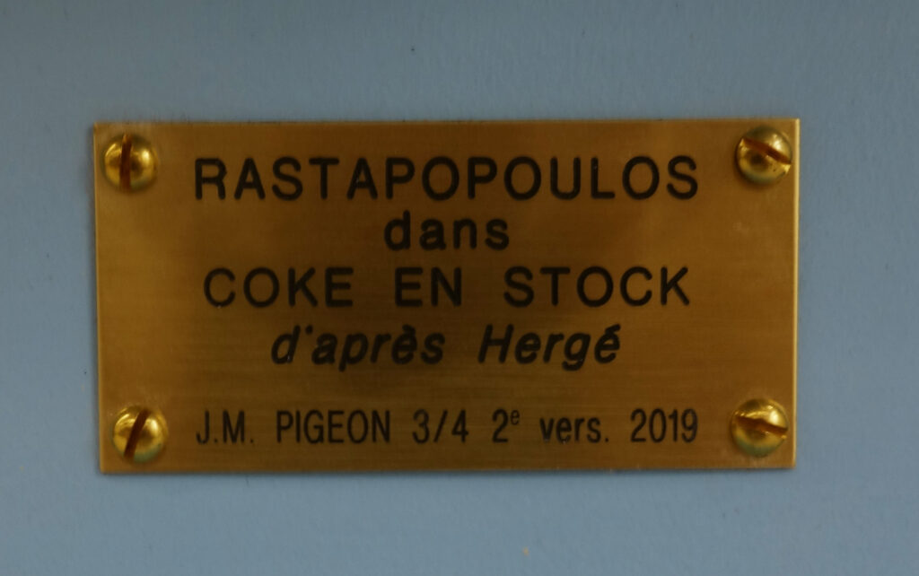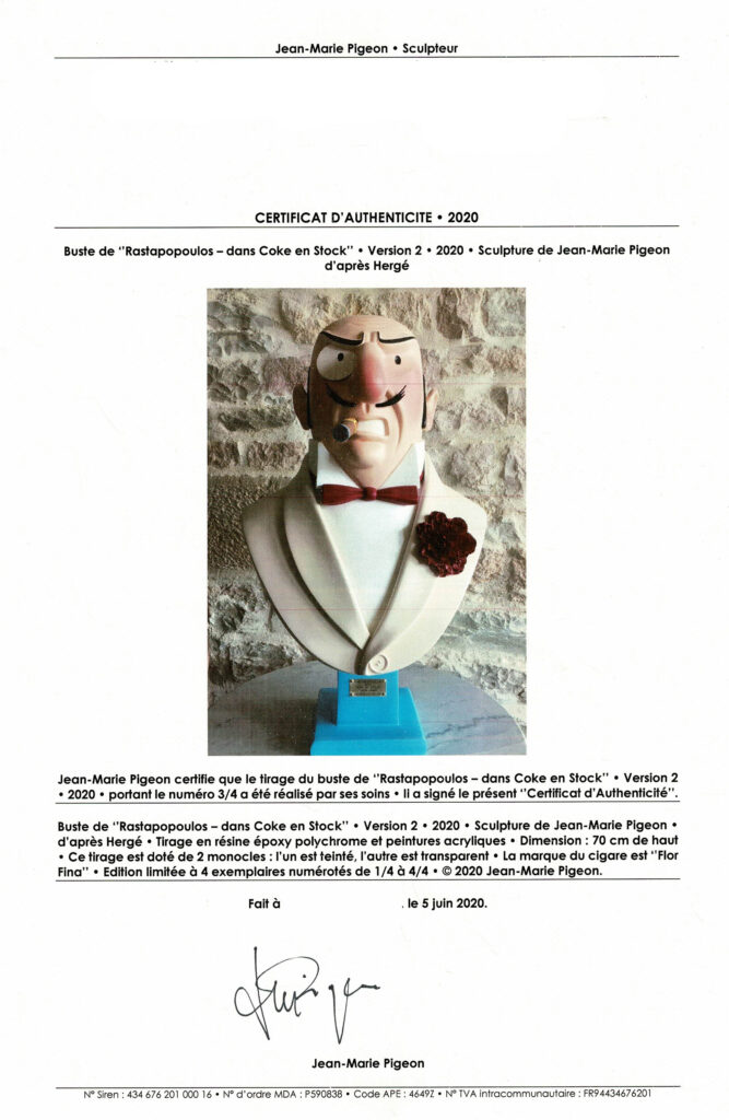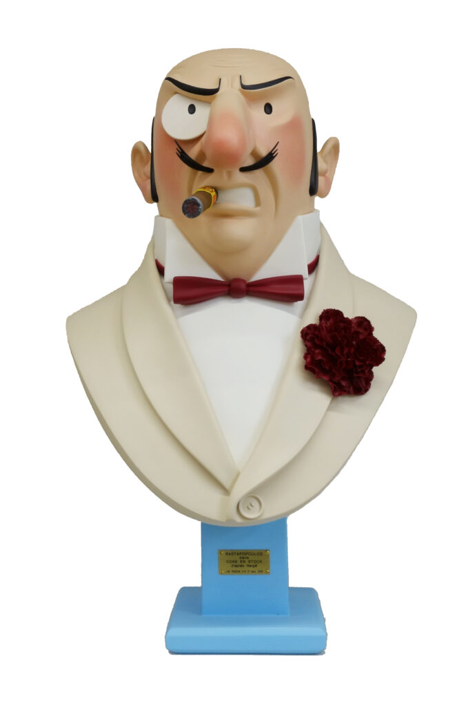 PIGEON : Rastapopoulos, sculpture inspirée des aventures de Tintin Coke en Stock, réalisée par Jean-Marie Pigeon. Résine époxy polychrome et peintures acryliques, limité et numéroté à 4 exemplaires, 70 cm.