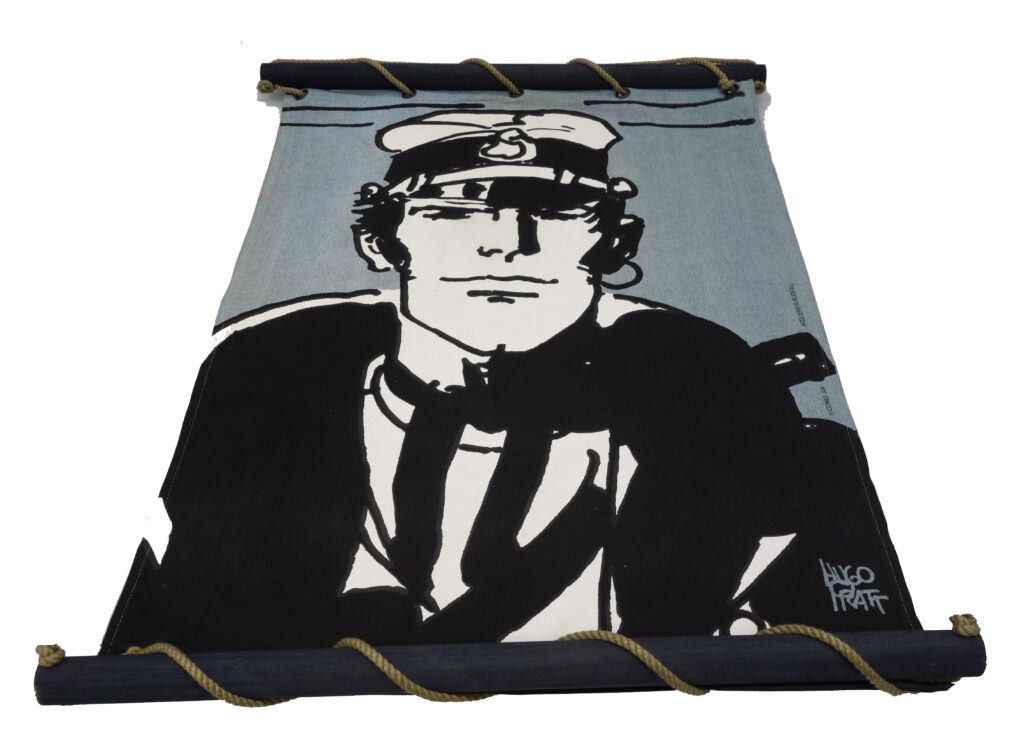 Kakémono Corto Maltese,Toile de lin brut, cordelette de marin, bois laqué noir, 110 cm x 80 cm.