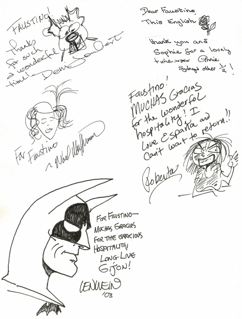 Djinn, dédicace à la mine de plomb sur feuille libre, au verso 5 autres dédicaces d’auteurs divers. Dimensions : 28 cm x 21 cm.