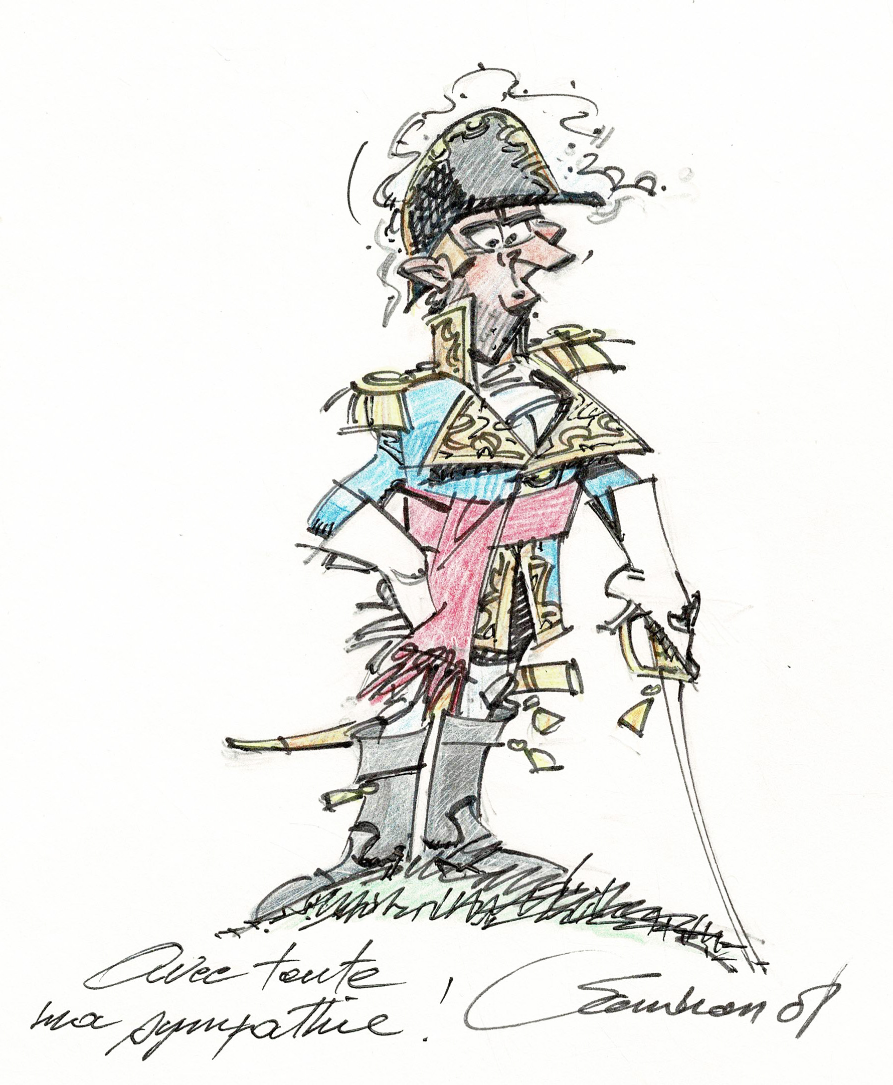 Godaille et Godasse, dédicace à l’encre de chine et aux crayons de couleurs sur feuille libre. Dimensions : 26,5 cm x 18,5 cm.