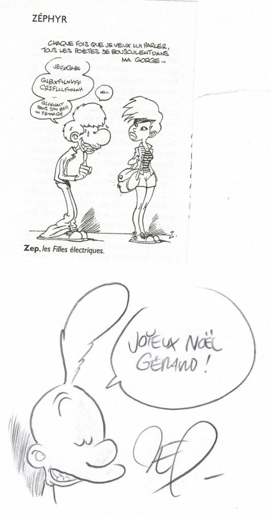 Titeuf, dédicace à la mine de plomb sur feuille libre. Dimensions : 20 cm x 12,5 cm.