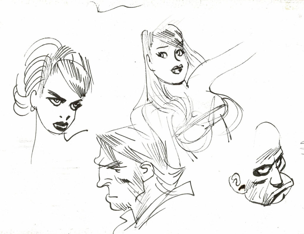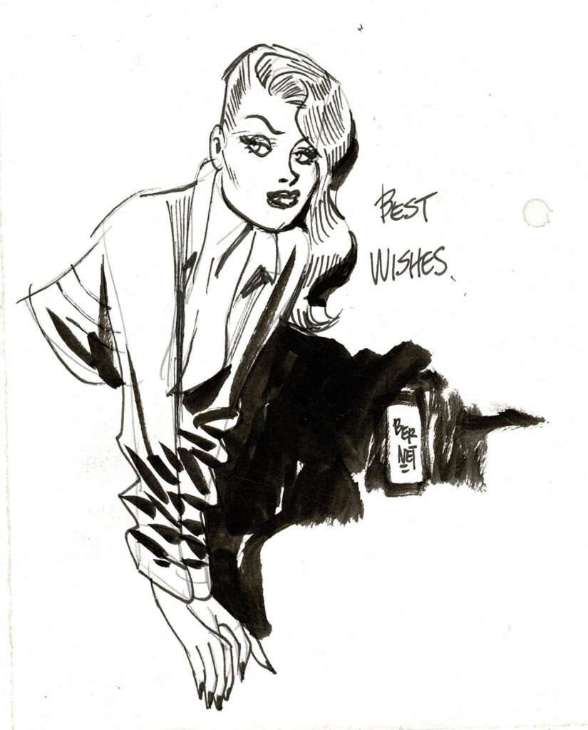 Pin-Up Best Wishes, dessin original à l’encre de chine. Au verso, quelques esquisses. Dimensions : 20 cm x 13,5 cm.