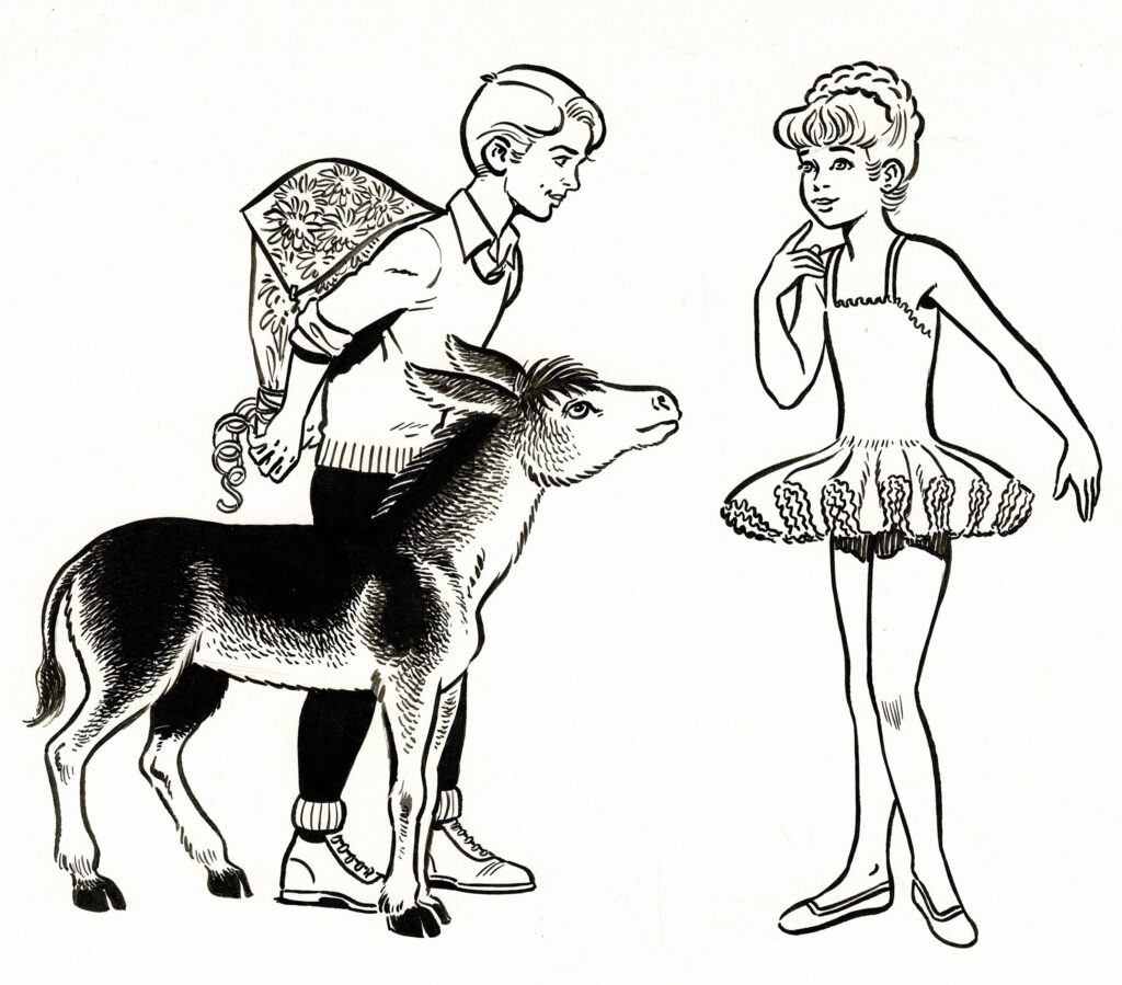 Pom et Teddy, dessin original à l’encre de chine réalisé pour un calendrier. Dimensions : 25 cm x 20 cm.
