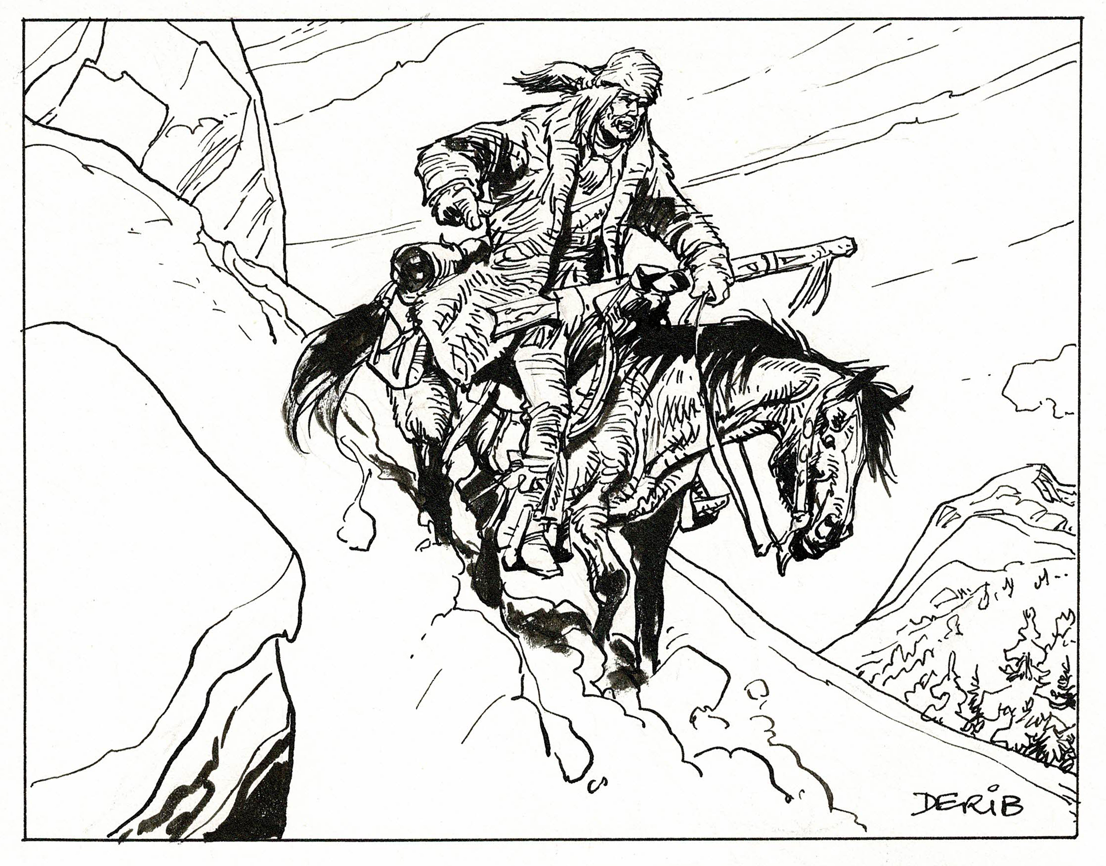 Buddy Longway, dessin original à l’encre de chine réalisé pour un calendrier. Dimensions : 20 cm x 16 cm.