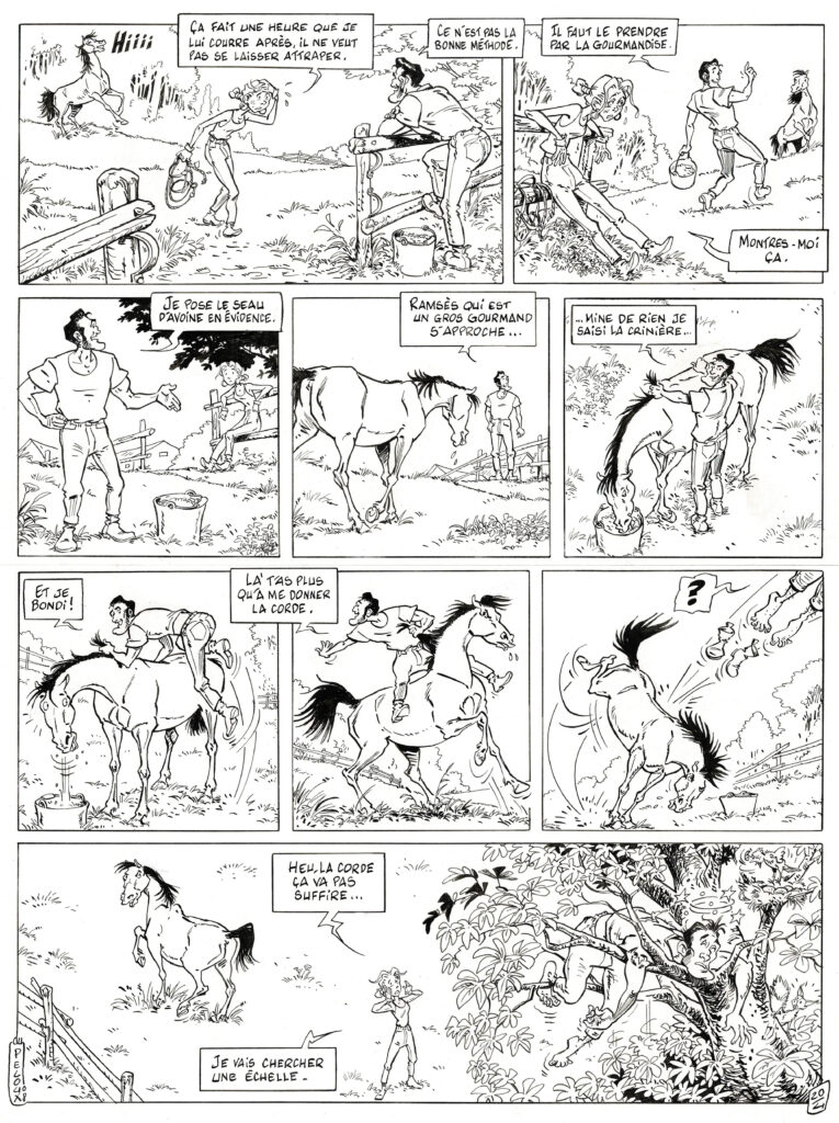 Triple galop, planche originale à l’encre de chine. Dimensions : 44,5 cm x 32,5 cm.