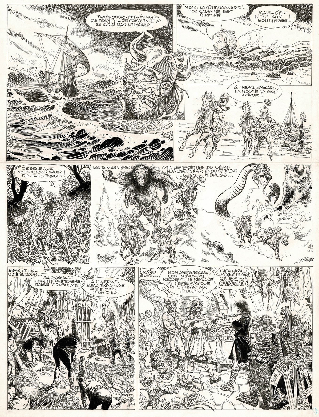 Harald le Viking rencontre Thorgal, planche originale à l’encre de chine publiée dans le journal Tintin et réalisée pour les 10 ans de Thorgal. Dimensions : 50 cm x 36,5 cm.