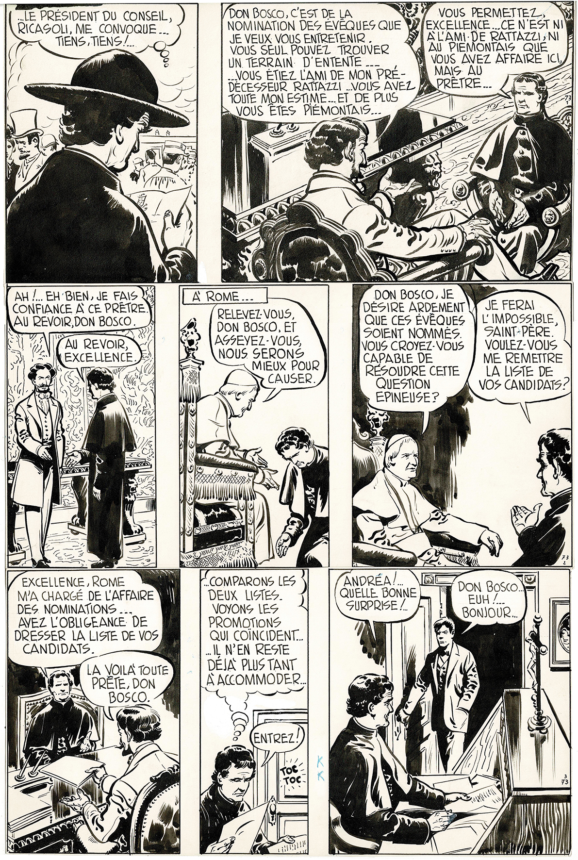 Don Bosco, planche originale à l’encre de chine. Dimensions : 45 cm x 30 cm.