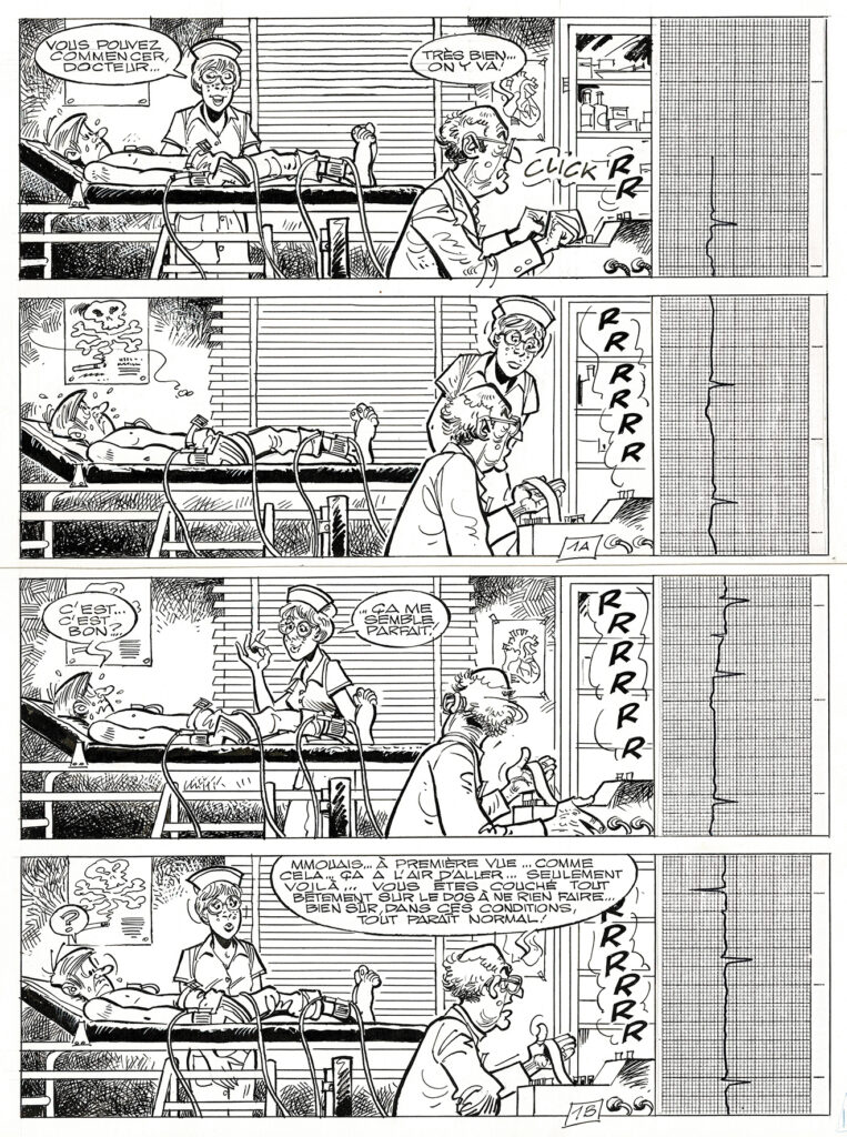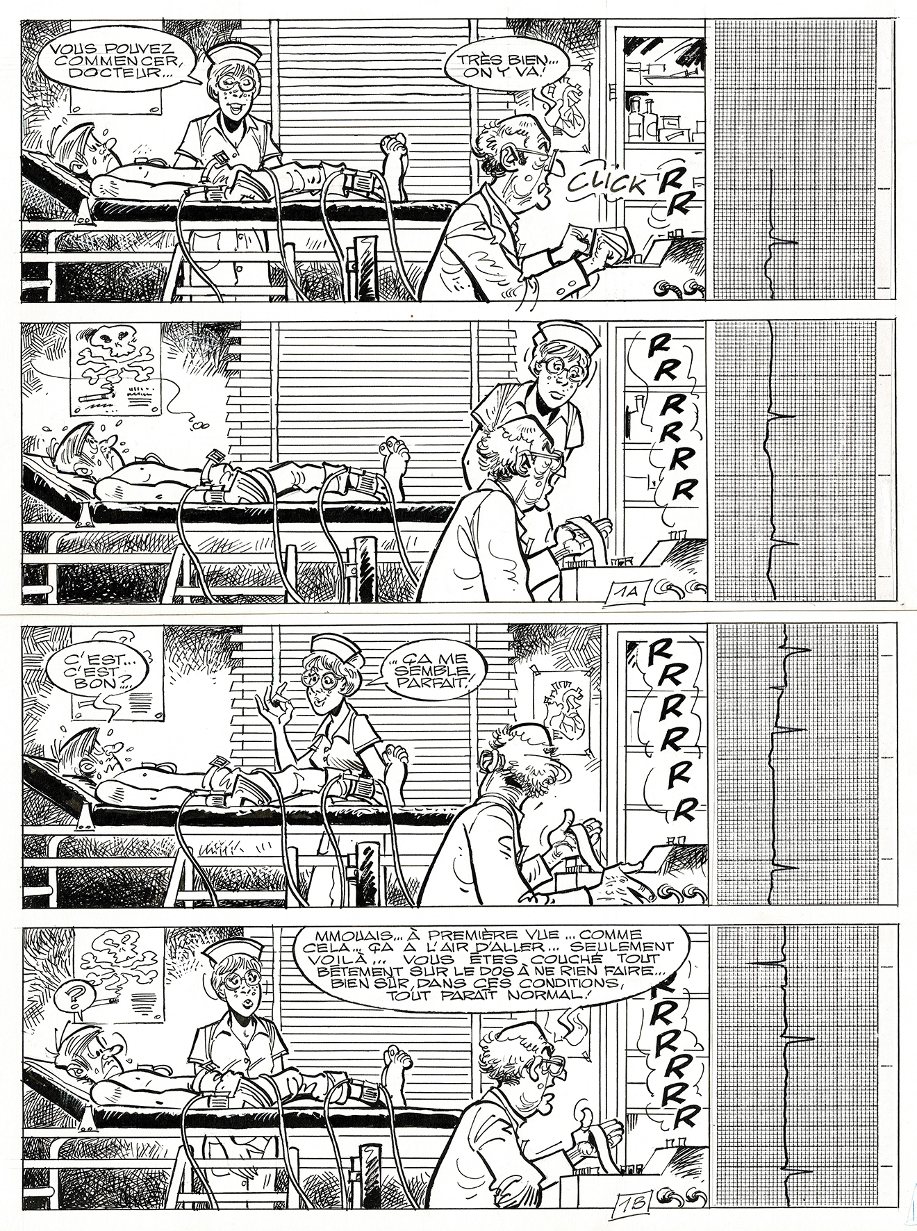 Pauvre Lampil Tome 5, planche originale à l’encre de chine pour cet album paru en 1990 chez Dupuis. Dimensions : 46,5 cm x 34 cm.
