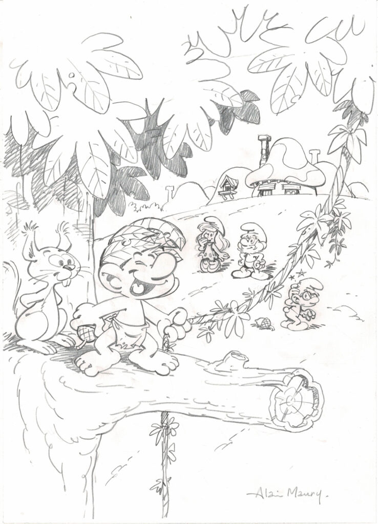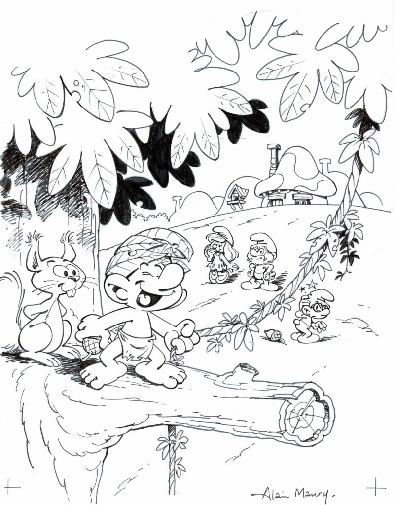 Les Schtroumpfs, dessin original à l’encre de chine. On joint le crayonné. Dimensions : 2x 29,5 cm x 21 cm.