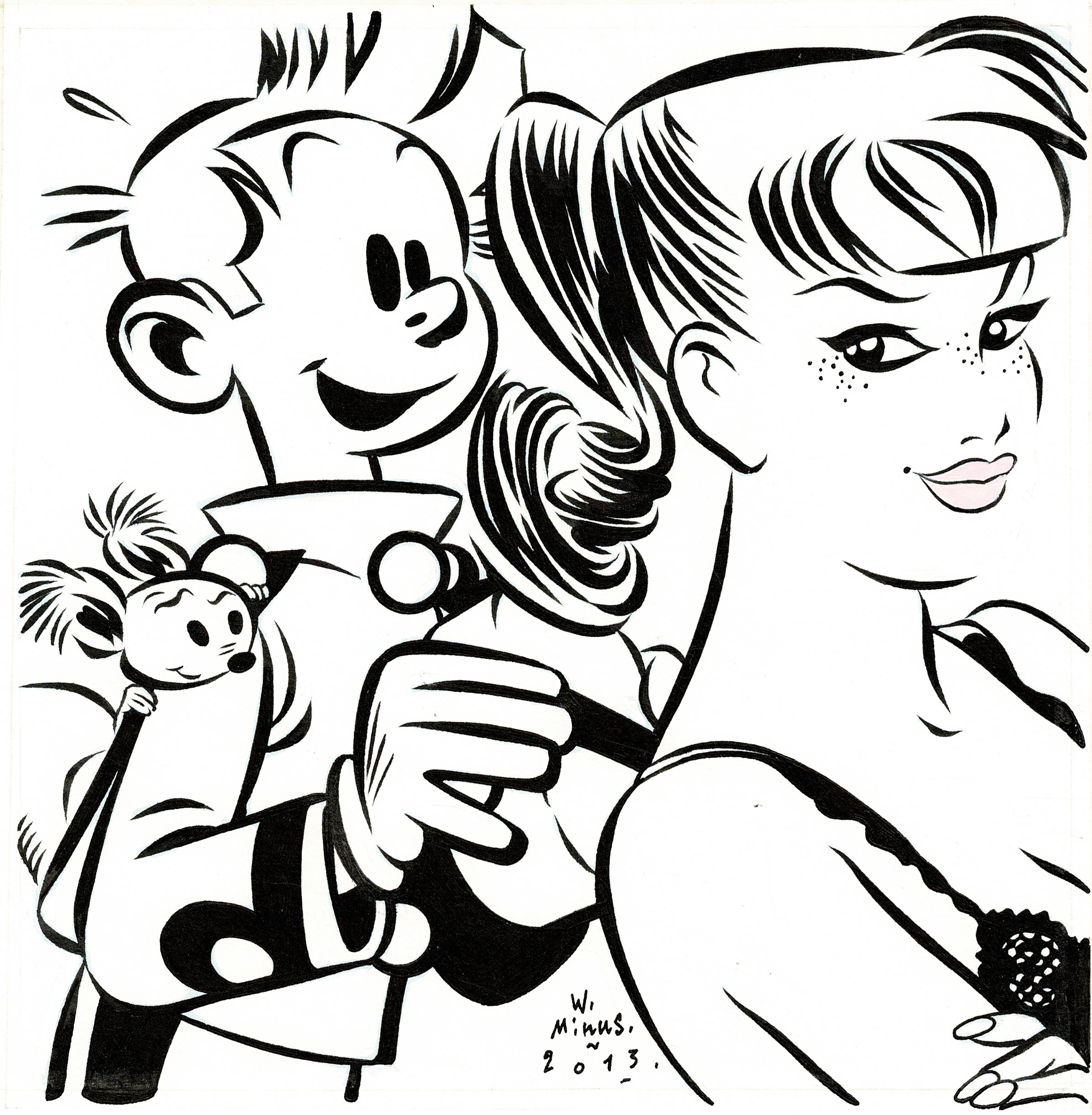 Spirou, Seccotine et Spip, dessin original à l’encre de chine. Dimensions : 21 cm x 21 cm.