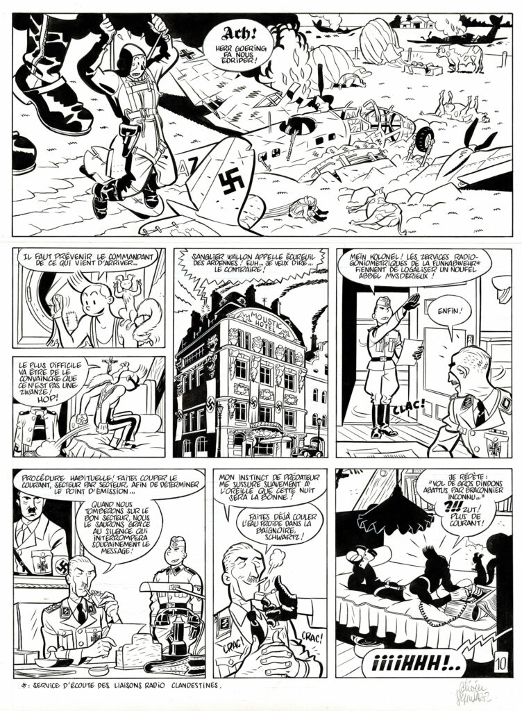 Spirou et Fantasio, le groom vert-de-gris, planche originale à l’encre de chine pour cet album paru en 2009 chez Dupuis. Dimensions : 41,5 cm x 32,5 cm.