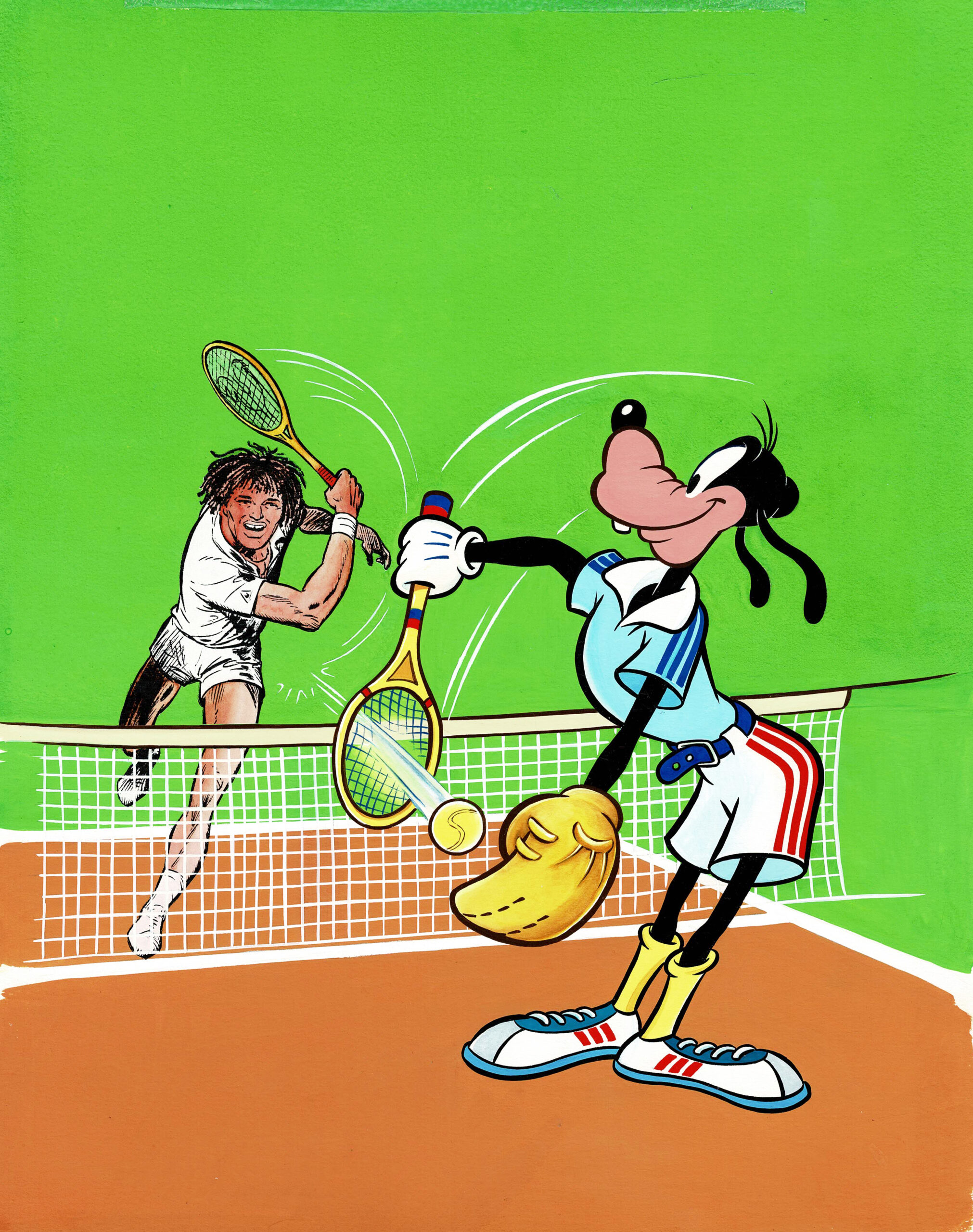 Dingo joue au tennis avec Yannick Noah, projet de couverture en couleurs directe pour le journal Mickey n° 1660 de 1984. Dimensions : 35 cm x 27,5 cm.