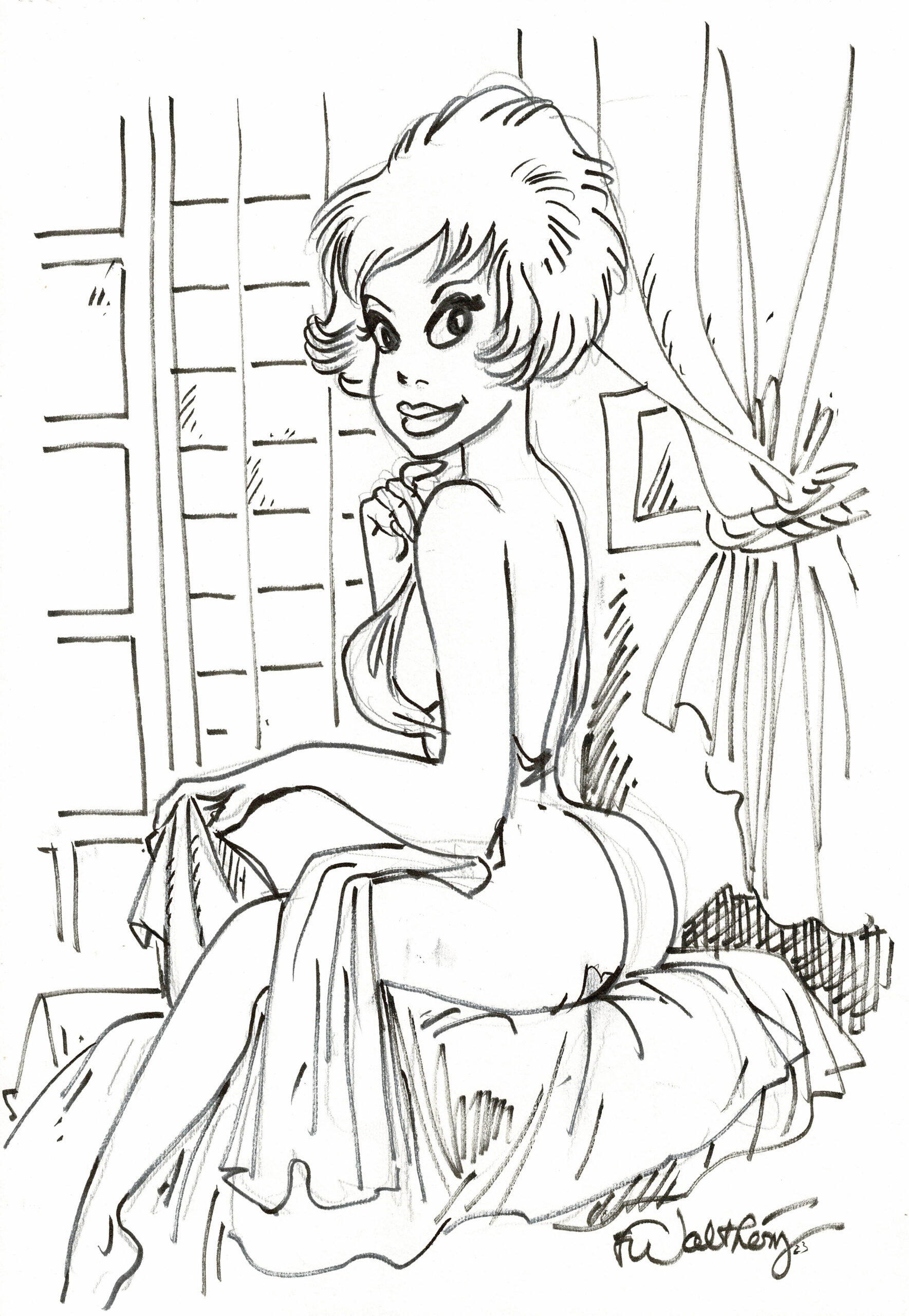 Natacha, dessin original à l’encre de chine, cachet de Walthéry au verso. Dimensions : 42 cm x 29,5 cm.
