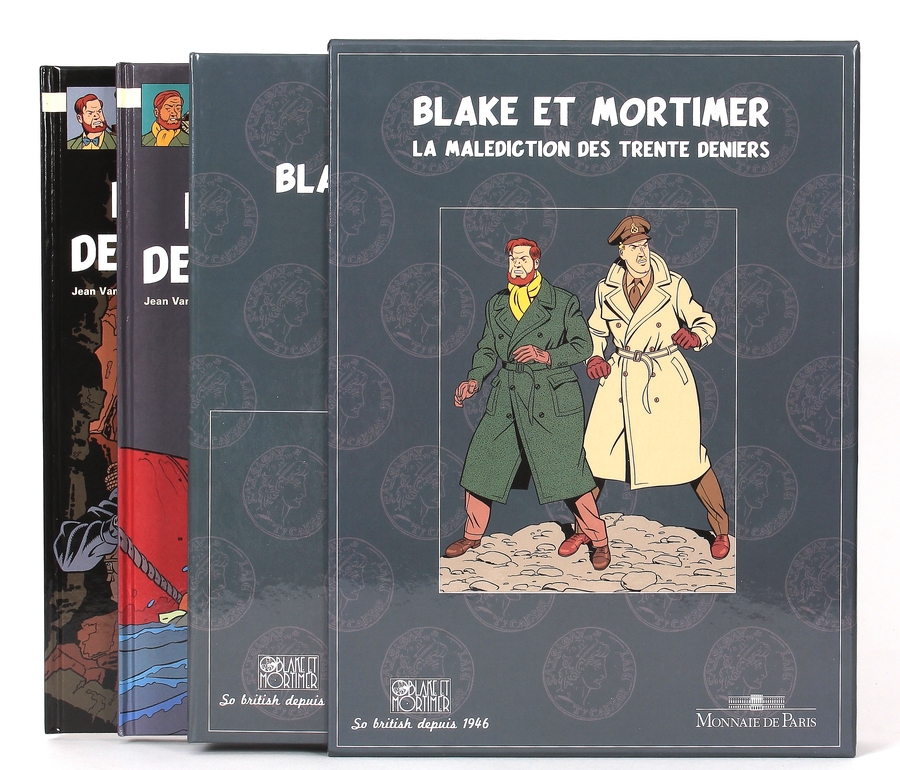 Coffret « La Malédiction des trente deniers » n°/1500 comprenant les 2 tomes et le coffret avec le dernier tibère, la médaille en bronze Blake et Mortimer avec certificat numéroté et un ex-libris numéroté (Ed. Blake et Mortimer – La Monnaie de Paris, 2010). Proche de l’état neuf.