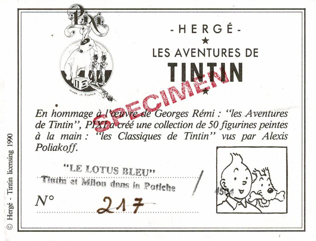PIXI : Tintin, 4504, la 1ère potiche, Le Lotus bleu, 1990, 6500 ex., 6 cm, B Certificat « Specimen ».