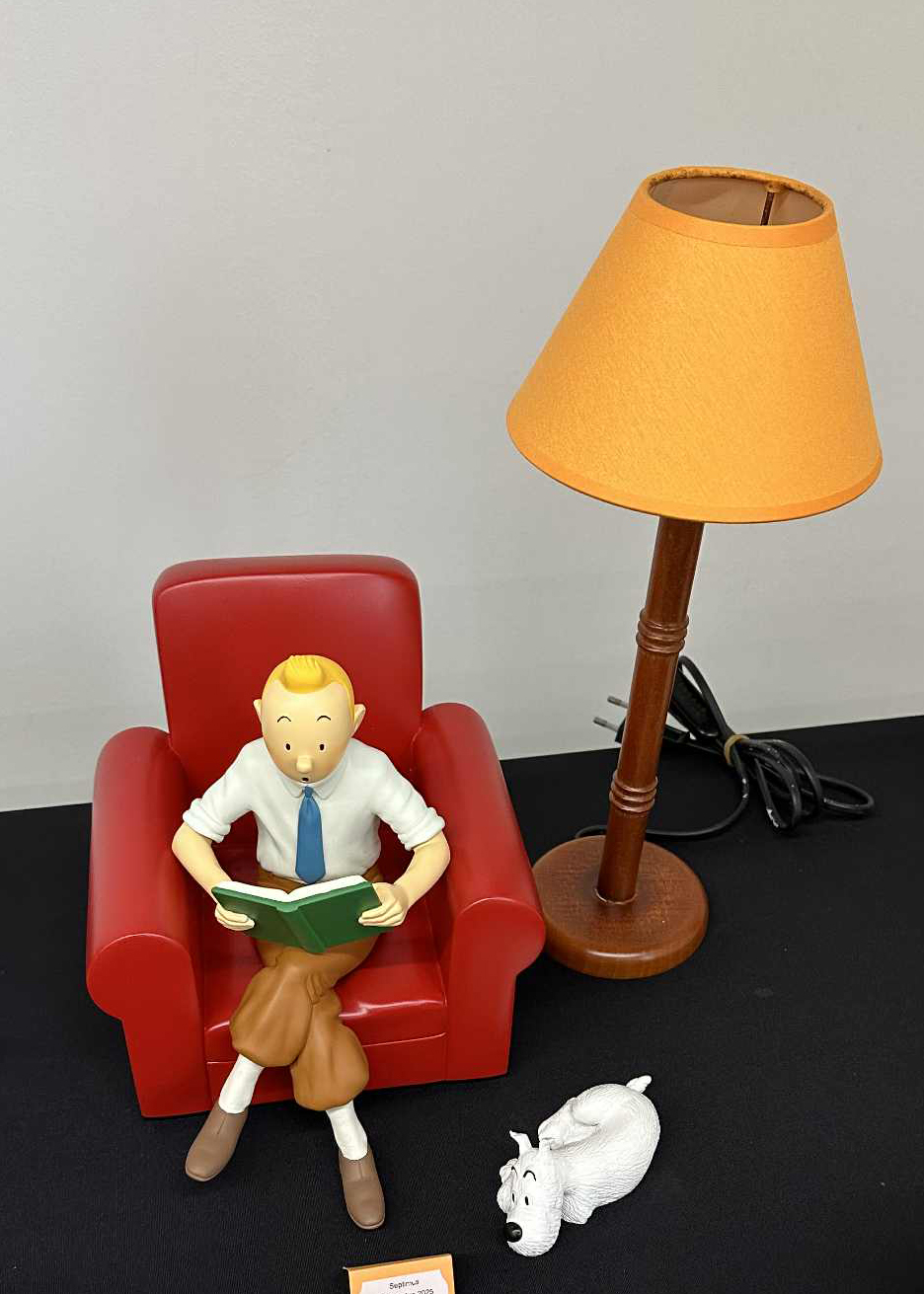 PIXI REGOUT : Tintin, Tintin lisant dans son fauteuil avec la lampe de chevet, bien complet de Milou couché (30004), Le Sceptre d’Ottokar, 1991, n° (+/- 1.300 ex.), 35 cm, avec boite d’origine et étiquette certificat.