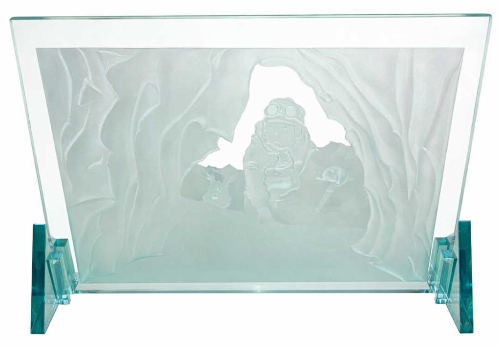 Tintin au Tibet, sculpture en verre gravée en relief, avec 2 socles en verre. Tintin et Milou sont devant la grotte de glace. éditée par Arkanis Productions en 1992. Très rare et très décoratif.