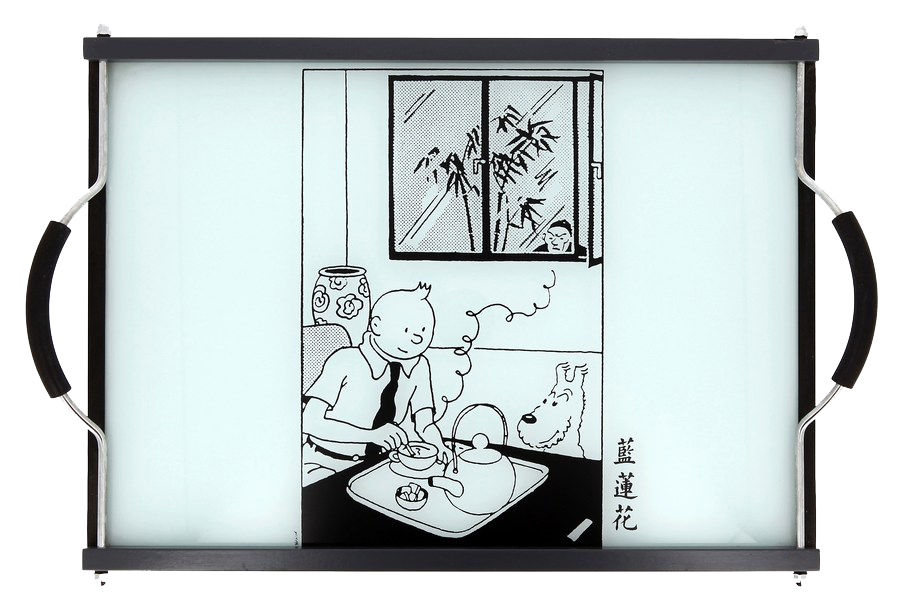 AXIS : Tintin, le grand plateau (32030), version luxe en verre sérigraphié, bois et inox, Le Lotus bleu, 1994, 50 cm x 35 cm.