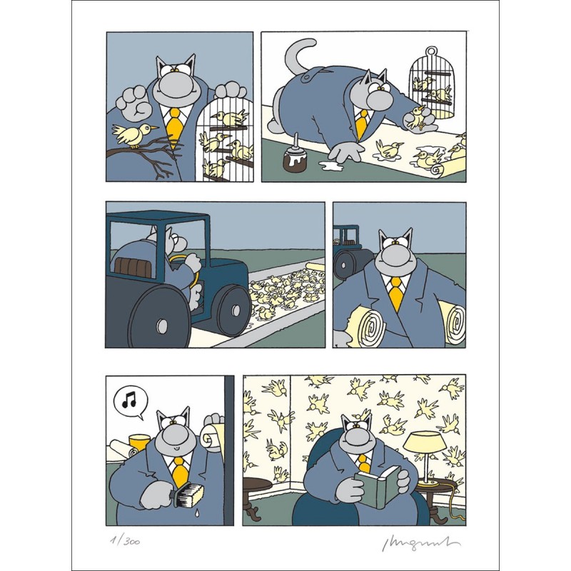 Le chat et les oiseaux, sérigraphie limitée à 300 exemplaires, numérotée et signée. Dimensions : 80 cm x 60 cm.