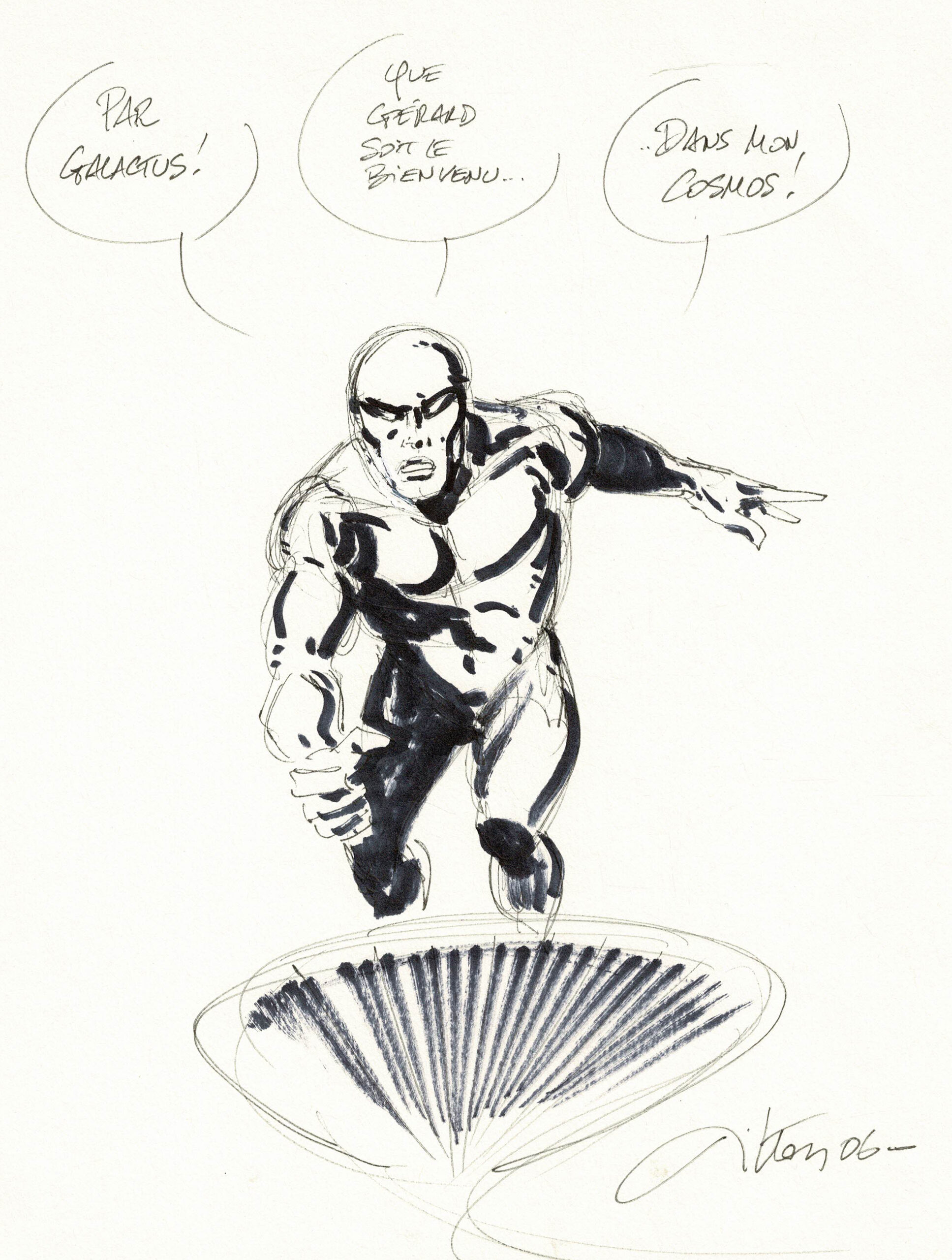 Le surfeur d’argent, dédicace au feutre fin sur feuille libre. Dimensions : 32 cm x 24 cm.