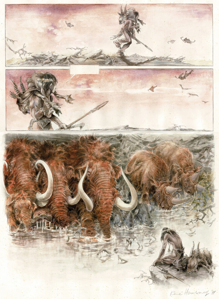 Les chasseurs de l’aube, planche originale à l’encre de chine et à l’aquarelle. La dernière case a servi de 4ème de couverture pour l’album. Dimensions : 50 cm x 36,5 cm.