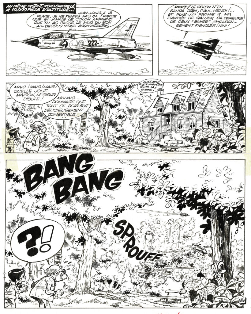 Sophie, Qui fait peur à Zoé ?, planche originale à l’encre de chine pour cet album paru en 1970 chez Dupuis. Dimensions : 41 cm x 33,5 cm.