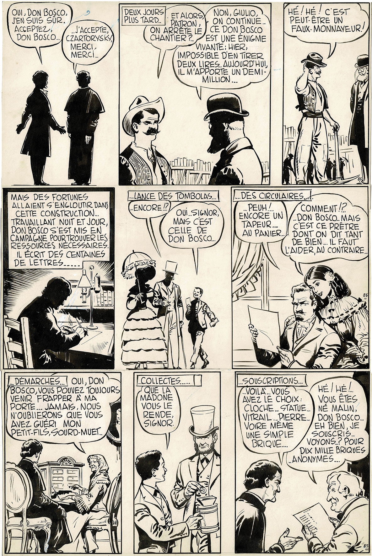Don Bosco, planche originale à l’encre de chine. Dimensions : 46 cm x 30,5 cm.