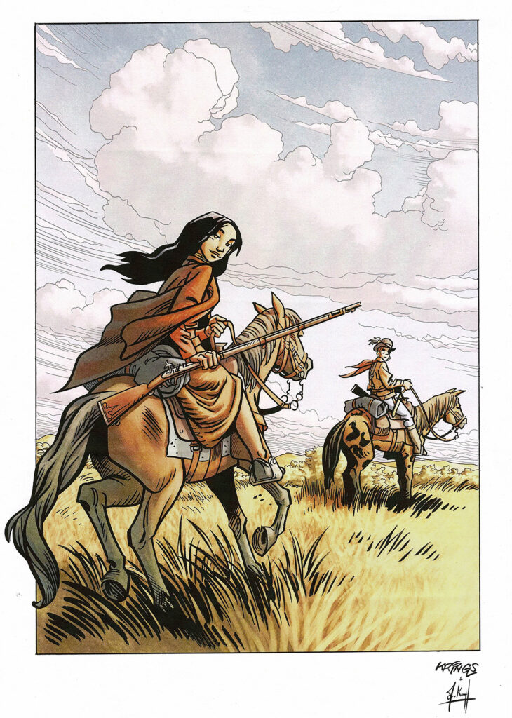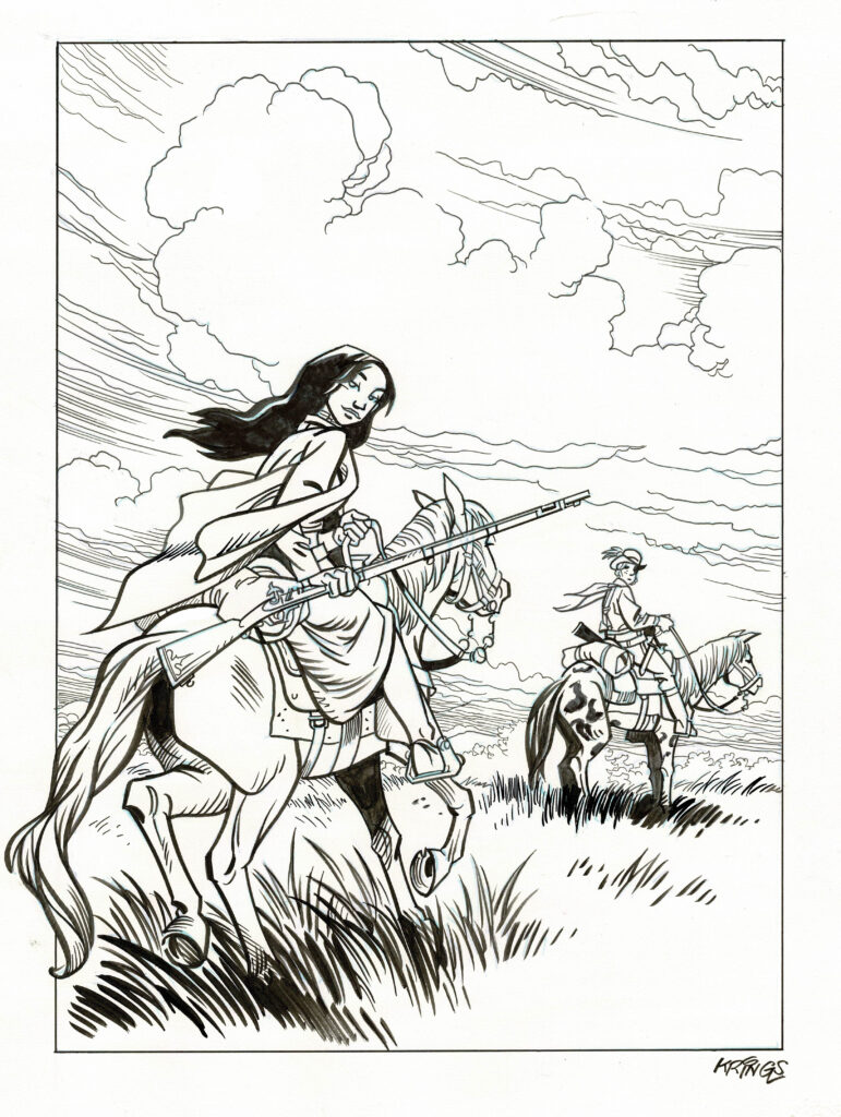La piste de l’Oregon, couverture originale à l’encre de chine. On joint la mise en couleurs. Dimensions : 2x 42 cm x 29,5 cm.