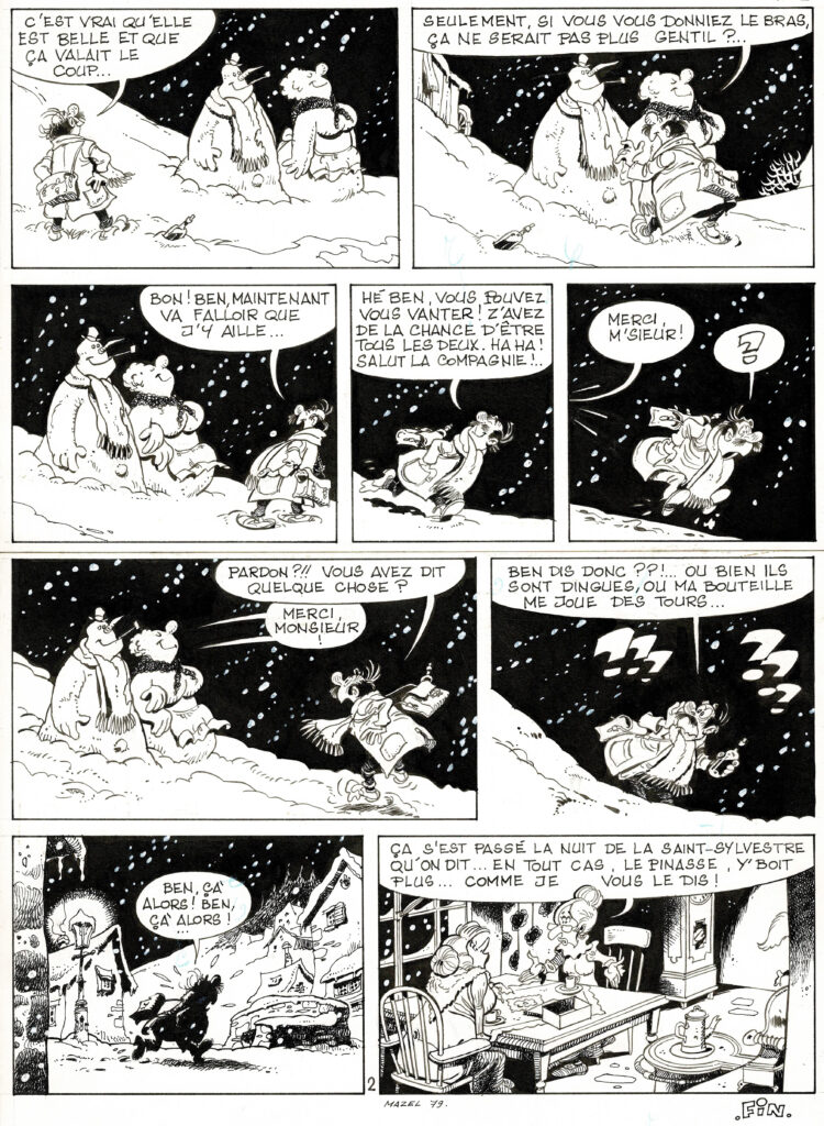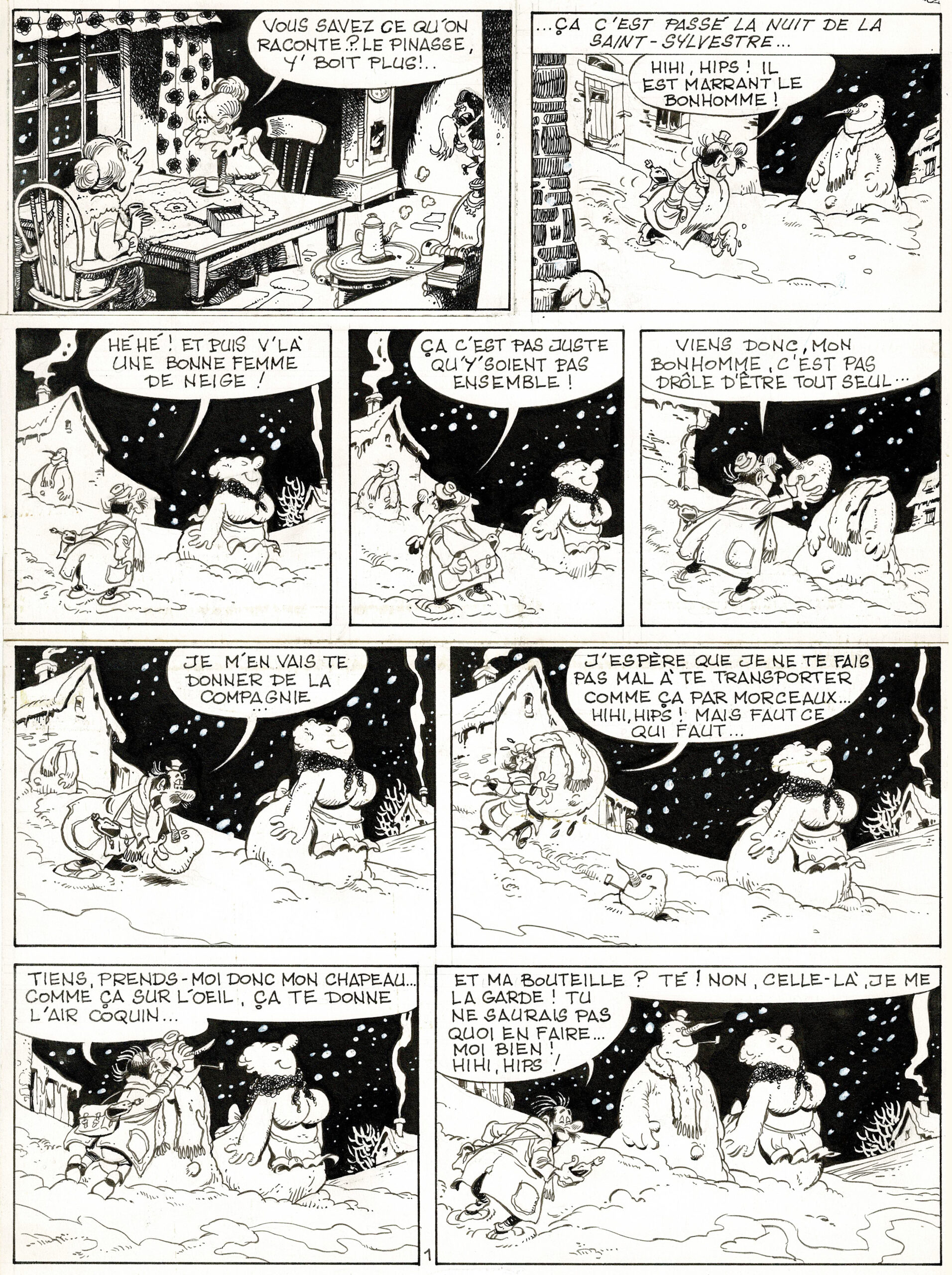 La bonne femme de neige, histoire courte en 2 planches originales à l’encre de chine. Dimensions : 2x 44,5 cm x 29,5 cm.