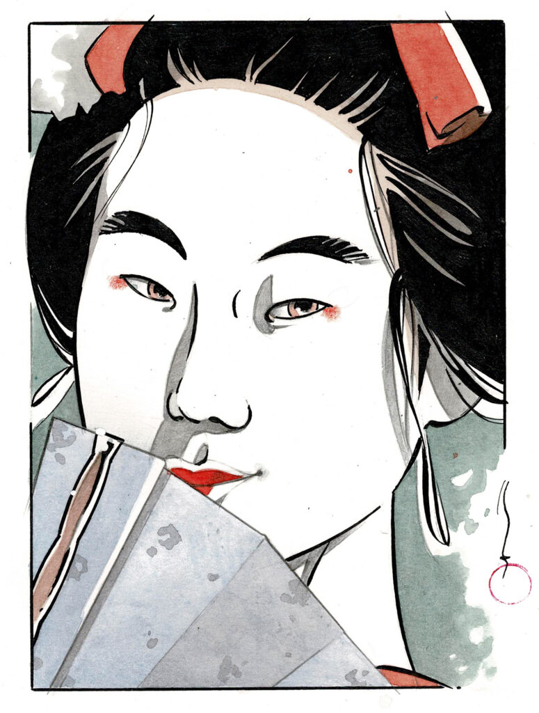 Geisha, dessin original à l’encre de chine et à l’aquarelle. Dimensions : 26,5 cm x 17,5 cm.