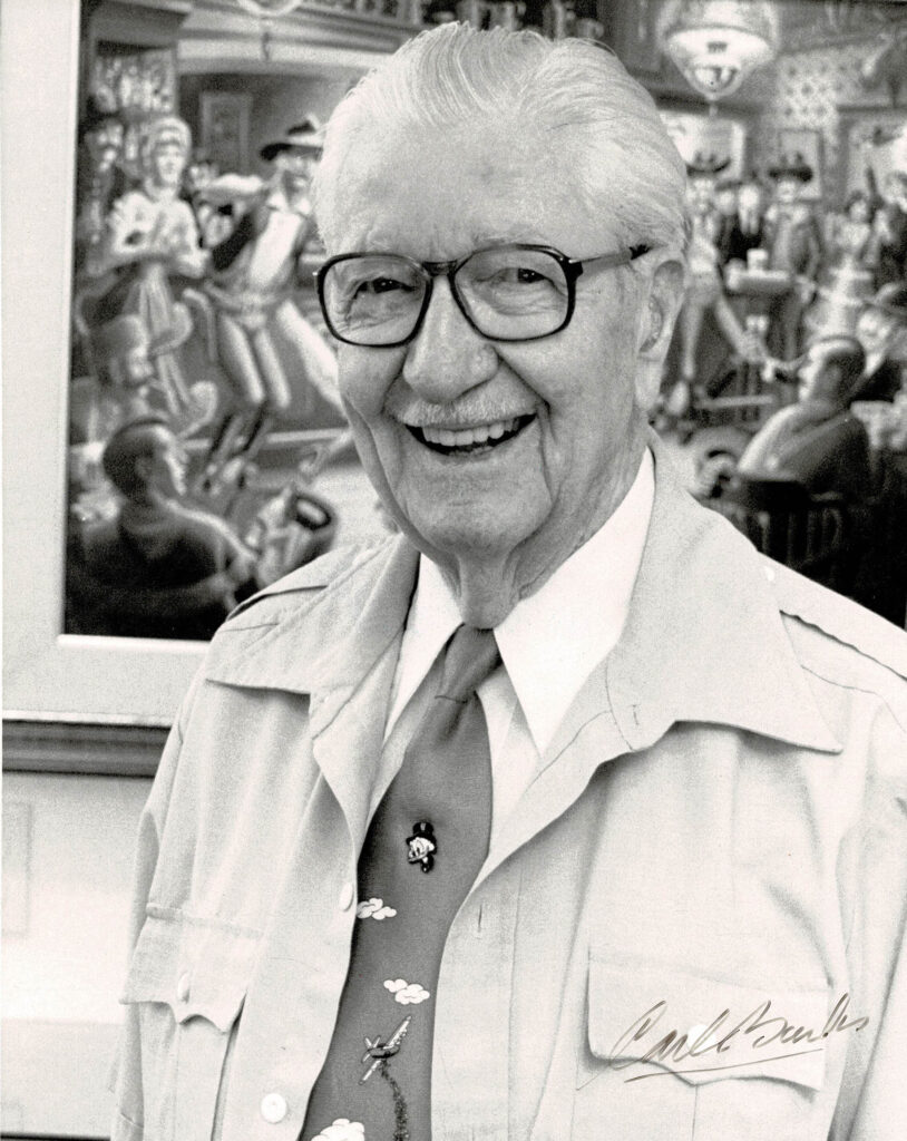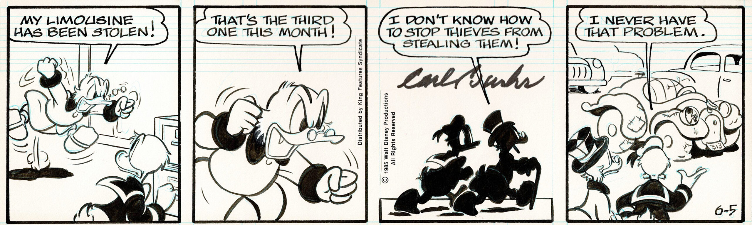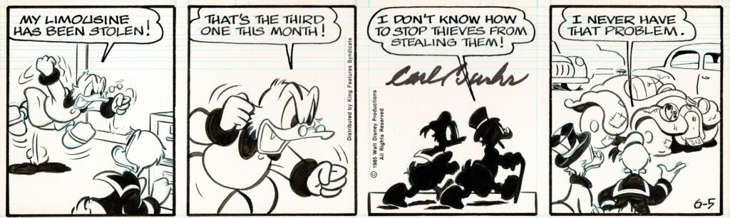 Scrooge McDuck (Oncle Picsou) et Donald Duck, strip à l’encre de Chine publié aux Editions Walt Disney Productions 1985. Dimensions : 33,5 cm x 10,5 cm. On joint une photo de Carl Barks numérotée et signée.