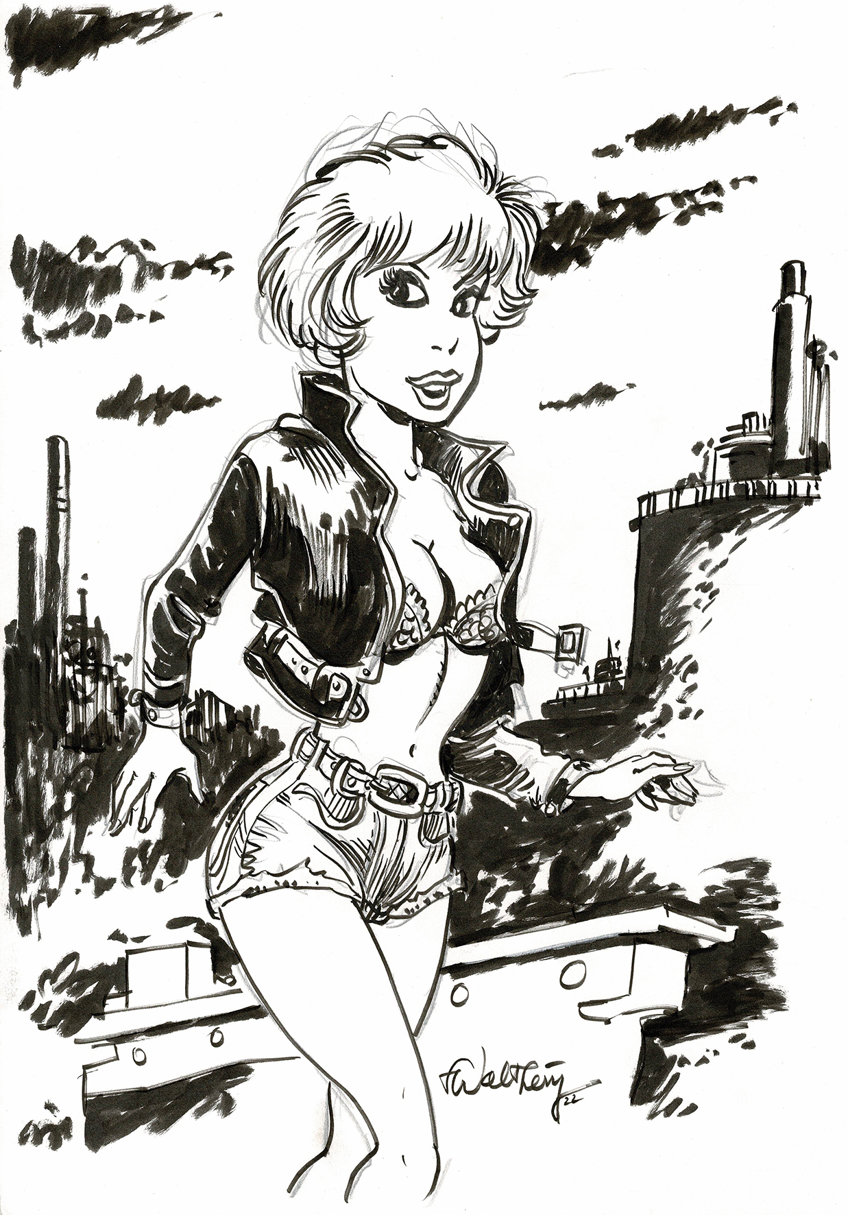 Natacha, dessin original à l’encre de chine, cachet de Walthéry au verso. Dimensions : 42 cm x 29,5 cm.