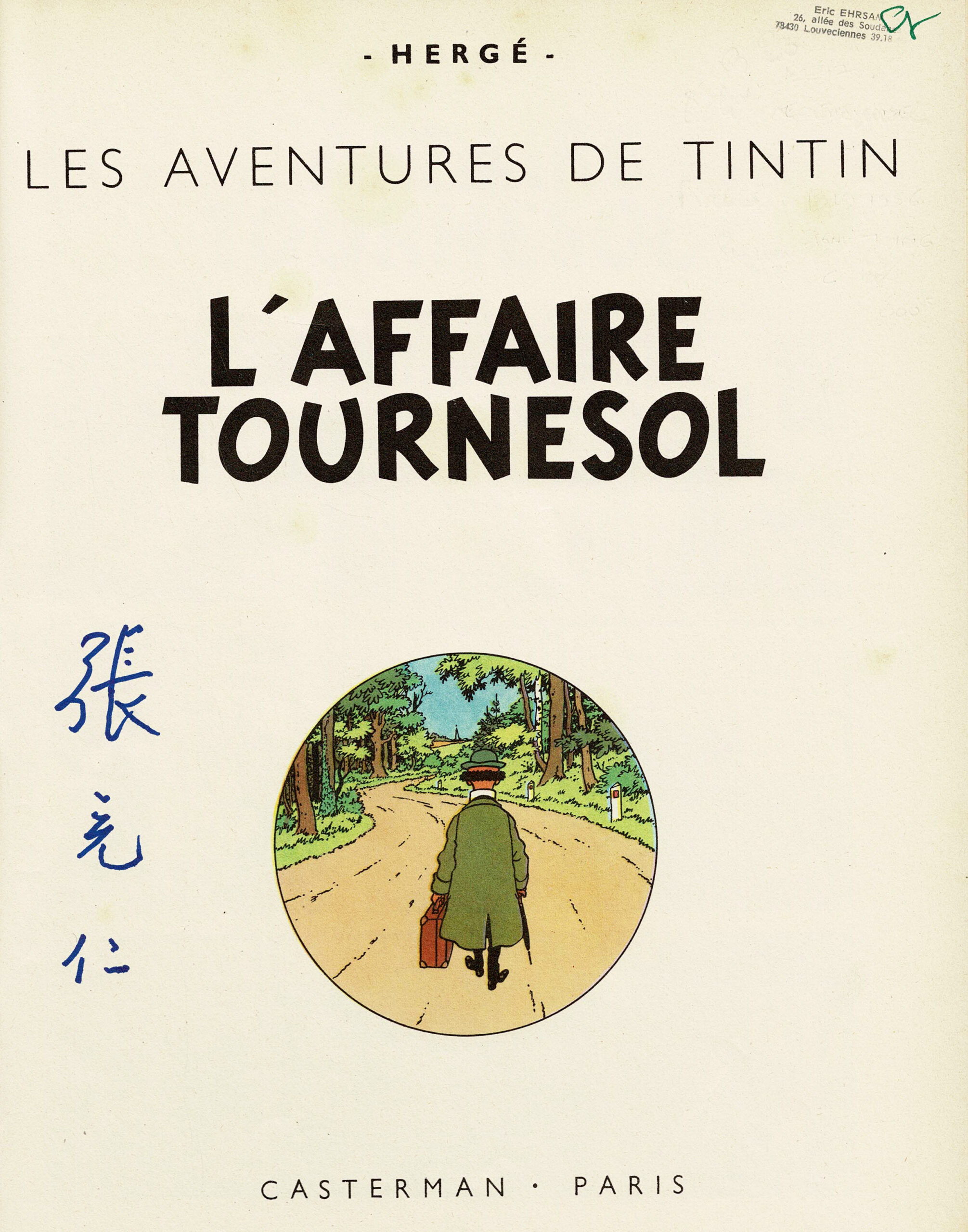 Tintin, L’affaire Tournesol, édition originale française de 1956 (B19), agrémenté d’une signature de Tchang. Très bon état.
