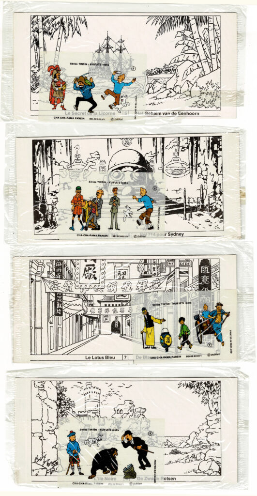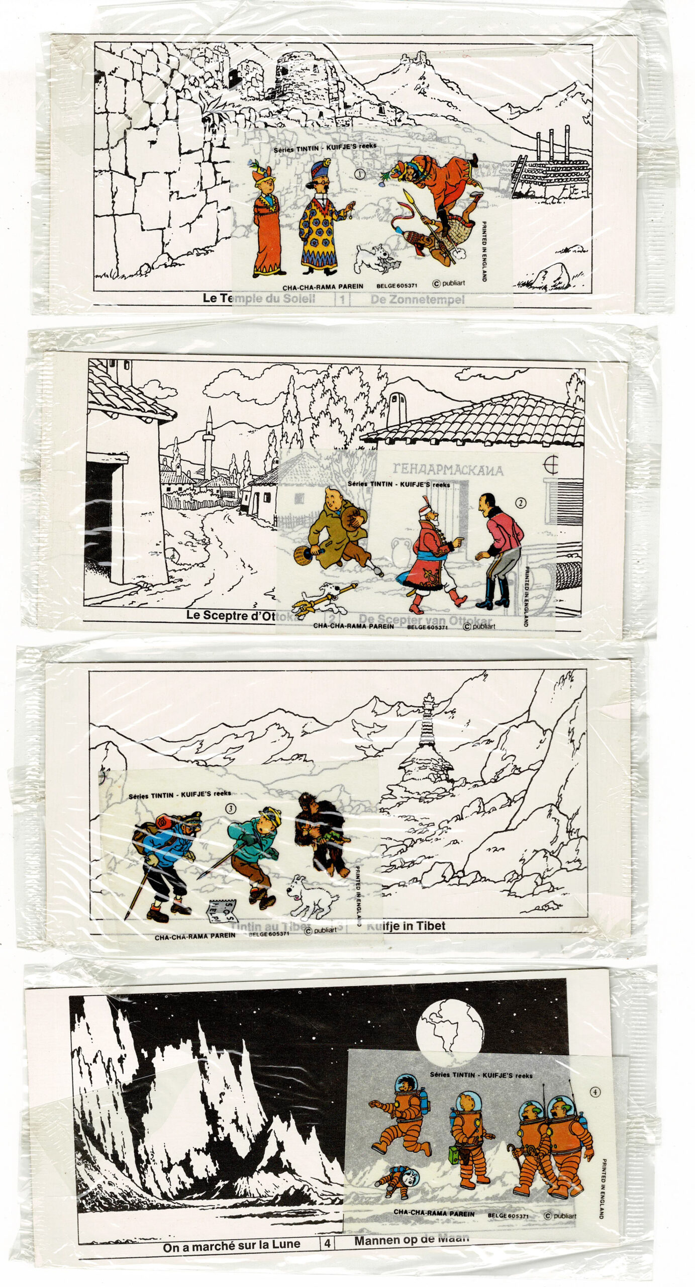 Ensemble de 8 décors avec leurs décalcomanies « Cha Cha Rama » (Ed. Parein, 1968). N°1 Le Temple du soleil, 2 Le Sceptre d’Ottokar, 3 Tintin au Tibet, 4 On a marché sur la lune, 5 Le Secret de la Licorne, 6 Vol 714 pour Sydney, 7 Le Lotus Bleu et 8 L’Ile noire. Proches de l’état neuf (dans leur emballage d’origine).