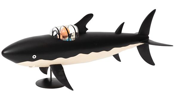 AROUTCHEFF : Tintin, sous-marin requin en résine polychrome, noir mat, grand modèle, dernière version connue où les ailerons font partie du corps du sous-marin, 46 cm.