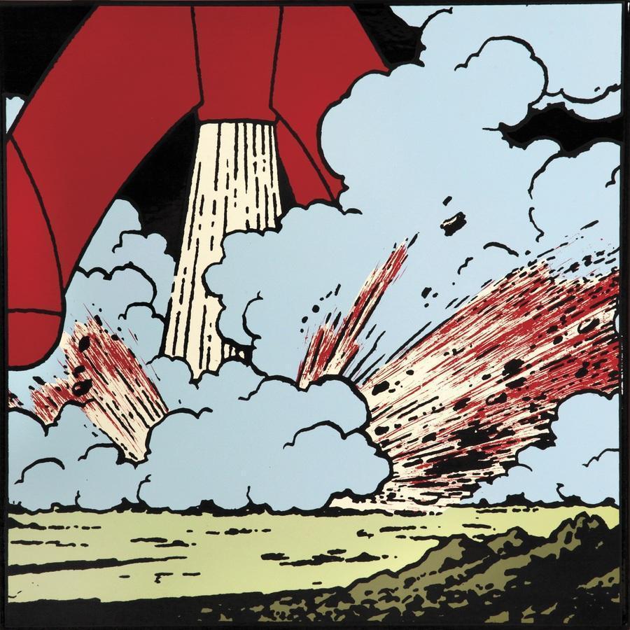 Tintin, plaque émaillée “Série lune” : La fusée alunissant – gros plan de la tuyaire, l’Emaillerie belge, 1985. Parfait état. Dimensions : 35 cm x 35 cm.