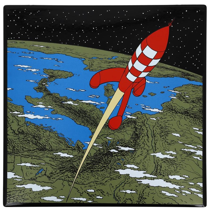 Tintin, plaque émaillée « Série lune » : La fusée quittant la terre, l’Emaillerie belge, 1985. Dimensions : 35 cm x 35 cm.