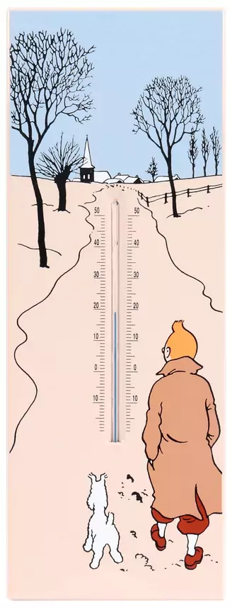 Tintin, plaque émaillée Le thermomètre, Tintin sous la neige, en état de fonctionnement, projet abandonné en 1996, L’Emaillerie belge, seulement quelques exemplaires réalisés. Rare. Dimensions : 45 cm x 17 cm.