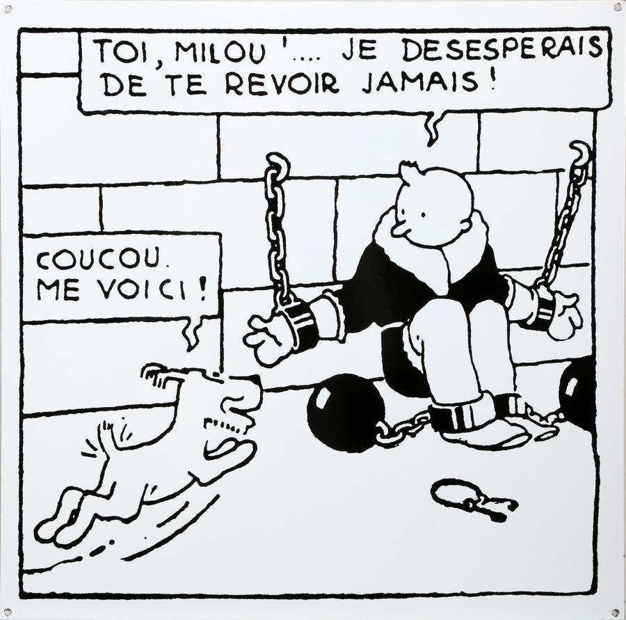 Tintin, plaque émaillée « Série Soviets » : Toi, Milou !, L’Emaillerie belge. Dimensions : 45 cm x 45 cm.