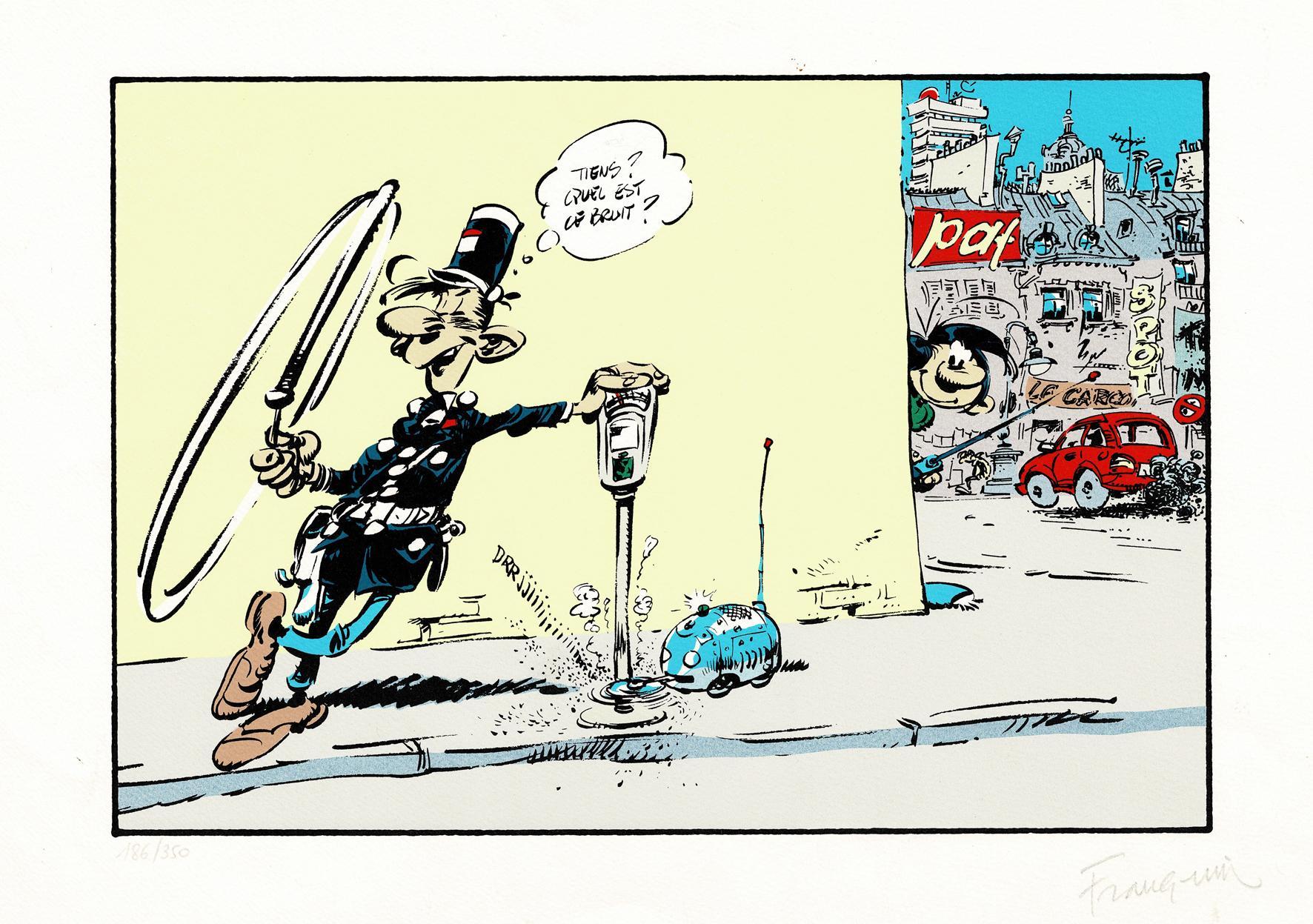 Sérigraphie Gaston Lagaffe, Longtarin et le parcmètre limitée à 350 exemplaires, numérotée et signée. Dimensions: 50 cm x 40 cm.