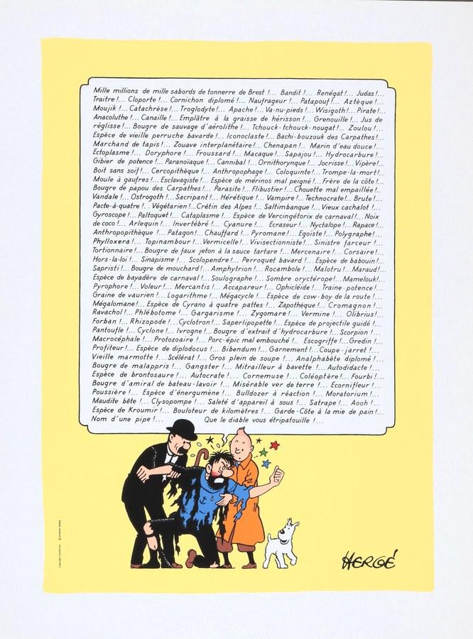 Tintin, sérigraphie « Les 220 jurons du capitaine Haddock » (Ed. Casterman, Studios Hergé). Dimensions : 65 cm x 49,5 cm.