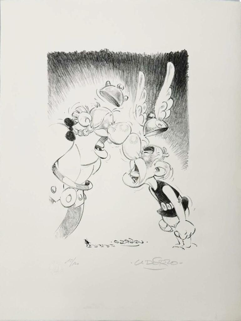 Astérix et Obélix, La dispute, lithographie limitée à 140 exemplaires numéroté et signé (avec cachet de lithographie authentique), 2001. Dimensions : 65 cm x 50 cm.
